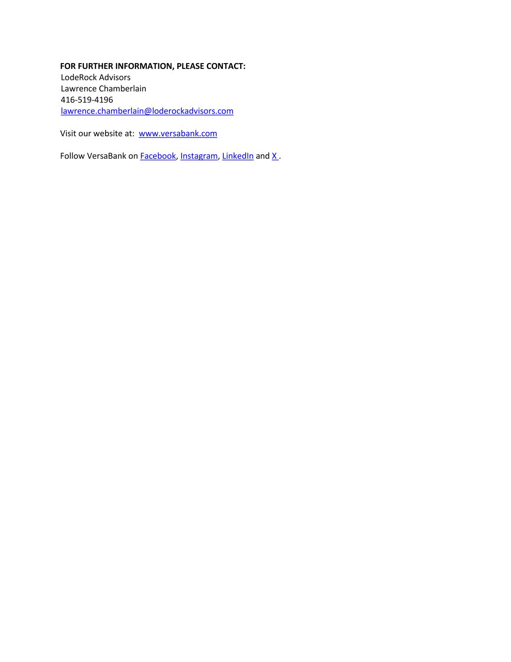 FOR FURTHER INFORMATION, PLEASE CONTACT: LodeRock Advisors Lawrence Chamberlain 416-519-4196 lawrence.chamberlain@loderockadvisors.com Visit our website at: www.versabank.com Follow VersaBank on Facebook, Instagram, LinkedIn and X .