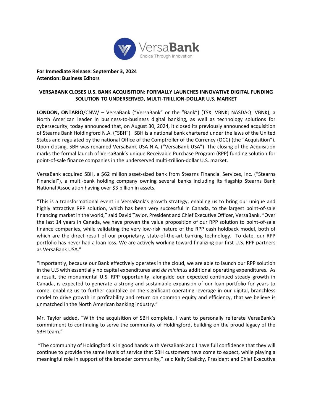 For Immediate Release: September 3, 2024 Attention: Business Editors VERSABANK CLOSES U.S. BANK ACQUISITION: FORMALLY LAUNCHES INNOVATIVE DIGITAL FUNDING SOLUTION TO UNDERSERVED, MULTI-TRILLION-DOLLAR U.S. MARKET LONDON, ONTARIO/CNW/ – VersaBank (“VersaBank” or the “Bank”) (TSX: VBNK; NASDAQ: VBNK), a North American leader in business-to-business digital banking, as well as technology solutions for cybersecurity, today announced that, on August 30, 2024, it closed its previously announced acquisition of Stearns Bank Holdingford N.A. (“SBH”). SBH is a national bank chartered under the laws of the United States and regulated by the national Office of the Comptroller of the Currency (OCC) (the “Acquisition”). Upon closing, SBH was renamed VersaBank USA N.A. (“VersaBank USA”). The closing of the Acquisition marks the formal launch of VersaBank’s unique Receivable Purchase Program (RPP) funding solution for point-of-sale finance companies in the underserved multi-trillion-dollar U.S. market. VersaBank acquired SBH, a $62 million asset-sized bank from Stearns Financial Services, Inc. (“Stearns Financial”), a multi-bank holding company owning several banks including its flagship Stearns Bank National Association having over $3 billion in assets. “This is a transformational event in VersaBank’s growth strategy, enabling us to bring our unique and highly attractive RPP solution, which has been very successful in Canada, to the largest point-of-sale financing market in the world,” said David Taylor, President and Chief Executive Officer, VersaBank. “Over the last 14 years in Canada, we have proven the value proposition of our RPP solution to point-of-sale finance companies, while validating the very low-risk nature of the RPP cash holdback model, both of which are the direct result of our proprietary, state-of-the-art banking technology. To date, our RPP portfolio has never had a loan loss. We are actively working toward finalizing our first U.S. RPP partners as VersaBank USA.” “Importantly, because our Bank effectively operates in the cloud, we are able to launch our RPP solution in the U.S with essentially no capital expenditures and de minimus additional operating expenditures. As a result, the monumental U.S. RPP opportunity, alongside our expected continued steady growth in Canada, is expected to generate a strong and sustainable expansion of our loan portfolio for years to come, enabling us to further capitalize on the significant operating leverage in our digital, branchless model to drive growth in profitability and return on common equity and efficiency, that we believe is unmatched in the North American banking industry.” Mr. Taylor added, “With the acquisition of SBH complete, I want to personally reiterate VersaBank’s commitment to continuing to serve the community of Holdingford, building on the proud legacy of the SBH team.” “The community of Holdingford is in good hands with VersaBank and I have full confidence that they will continue to provide the same levels of service that SBH customers have come to expect, while playing a meaningful role in support of the broader community,” said Kelly Skalicky, President and Chief Executive