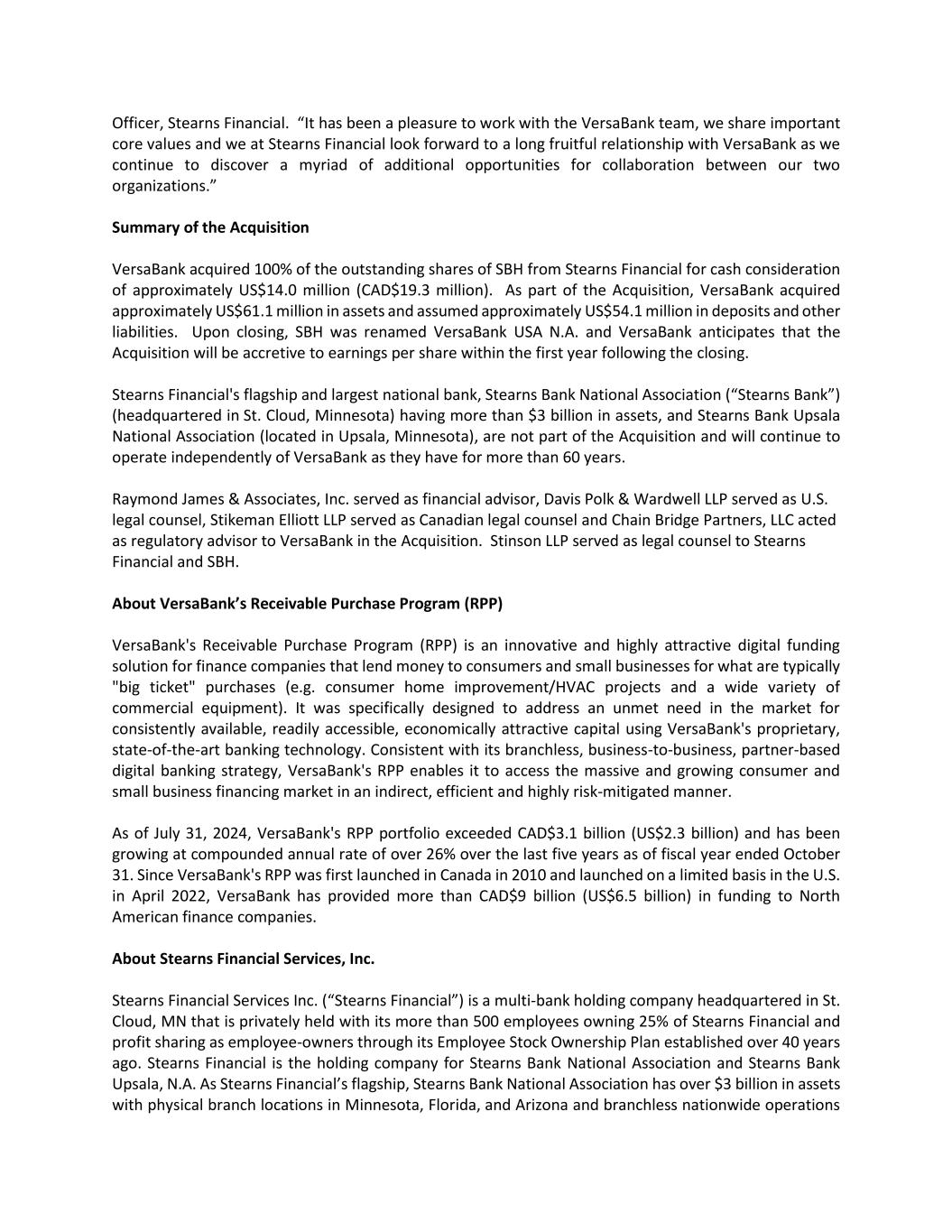 Officer, Stearns Financial. “It has been a pleasure to work with the VersaBank team, we share important core values and we at Stearns Financial look forward to a long fruitful relationship with VersaBank as we continue to discover a myriad of additional opportunities for collaboration between our two organizations.” Summary of the Acquisition VersaBank acquired 100% of the outstanding shares of SBH from Stearns Financial for cash consideration of approximately US$14.0 million (CAD$19.3 million). As part of the Acquisition, VersaBank acquired approximately US$61.1 million in assets and assumed approximately US$54.1 million in deposits and other liabilities. Upon closing, SBH was renamed VersaBank USA N.A. and VersaBank anticipates that the Acquisition will be accretive to earnings per share within the first year following the closing. Stearns Financial's flagship and largest national bank, Stearns Bank National Association (“Stearns Bank”) (headquartered in St. Cloud, Minnesota) having more than $3 billion in assets, and Stearns Bank Upsala National Association (located in Upsala, Minnesota), are not part of the Acquisition and will continue to operate independently of VersaBank as they have for more than 60 years. Raymond James & Associates, Inc. served as financial advisor, Davis Polk & Wardwell LLP served as U.S. legal counsel, Stikeman Elliott LLP served as Canadian legal counsel and Chain Bridge Partners, LLC acted as regulatory advisor to VersaBank in the Acquisition. Stinson LLP served as legal counsel to Stearns Financial and SBH. About VersaBank’s Receivable Purchase Program (RPP) VersaBank's Receivable Purchase Program (RPP) is an innovative and highly attractive digital funding solution for finance companies that lend money to consumers and small businesses for what are typically "big ticket" purchases (e.g. consumer home improvement/HVAC projects and a wide variety of commercial equipment). It was specifically designed to address an unmet need in the market for consistently available, readily accessible, economically attractive capital using VersaBank's proprietary, state-of-the-art banking technology. Consistent with its branchless, business-to-business, partner-based digital banking strategy, VersaBank's RPP enables it to access the massive and growing consumer and small business financing market in an indirect, efficient and highly risk-mitigated manner. As of July 31, 2024, VersaBank's RPP portfolio exceeded CAD$3.1 billion (US$2.3 billion) and has been growing at compounded annual rate of over 26% over the last five years as of fiscal year ended October 31. Since VersaBank's RPP was first launched in Canada in 2010 and launched on a limited basis in the U.S. in April 2022, VersaBank has provided more than CAD$9 billion (US$6.5 billion) in funding to North American finance companies. About Stearns Financial Services, Inc. Stearns Financial Services Inc. (“Stearns Financial”) is a multi-bank holding company headquartered in St. Cloud, MN that is privately held with its more than 500 employees owning 25% of Stearns Financial and profit sharing as employee-owners through its Employee Stock Ownership Plan established over 40 years ago. Stearns Financial is the holding company for Stearns Bank National Association and Stearns Bank Upsala, N.A. As Stearns Financial’s flagship, Stearns Bank National Association has over $3 billion in assets with physical branch locations in Minnesota, Florida, and Arizona and branchless nationwide operations