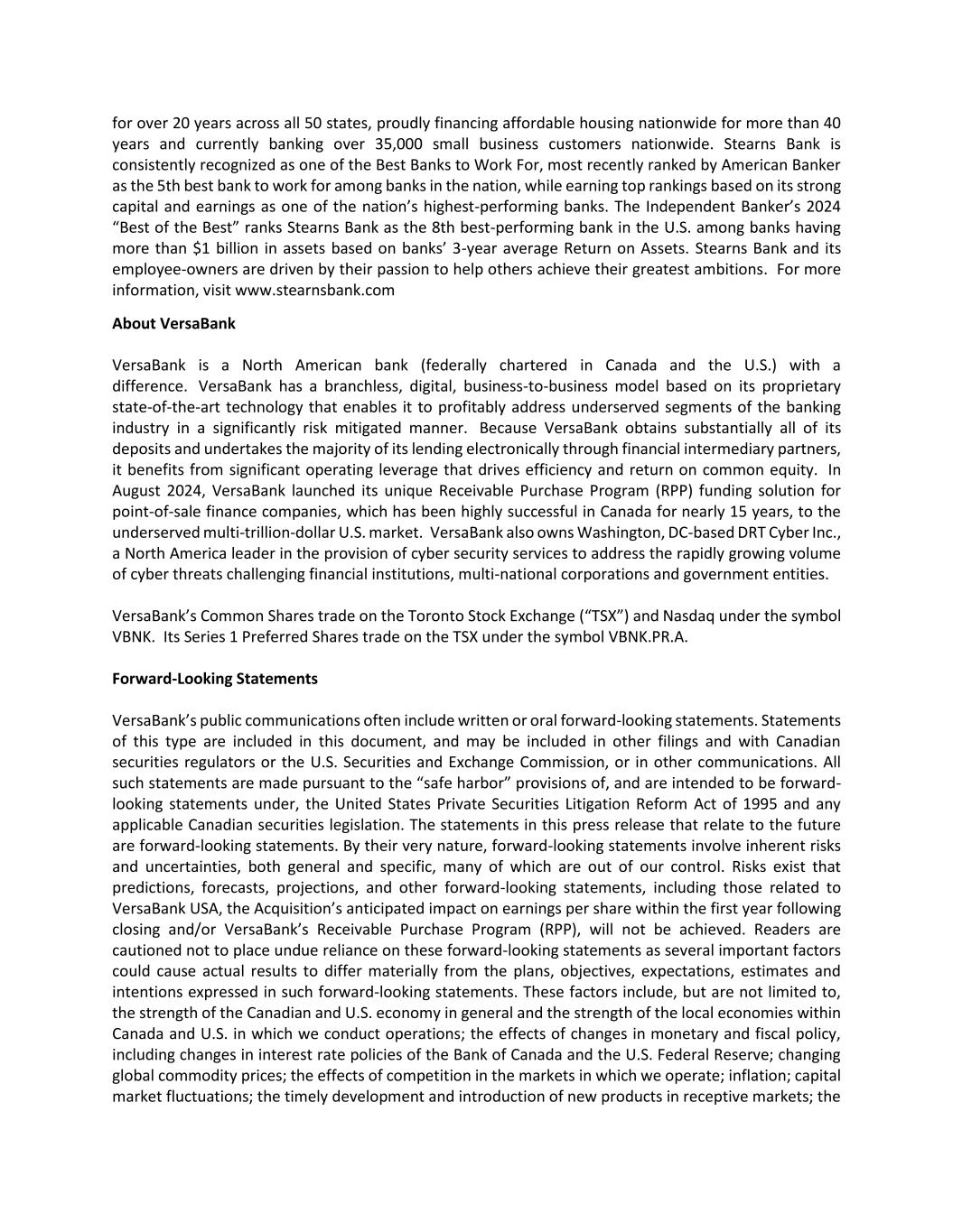for over 20 years across all 50 states, proudly financing affordable housing nationwide for more than 40 years and currently banking over 35,000 small business customers nationwide. Stearns Bank is consistently recognized as one of the Best Banks to Work For, most recently ranked by American Banker as the 5th best bank to work for among banks in the nation, while earning top rankings based on its strong capital and earnings as one of the nation’s highest-performing banks. The Independent Banker’s 2024 “Best of the Best” ranks Stearns Bank as the 8th best-performing bank in the U.S. among banks having more than $1 billion in assets based on banks’ 3-year average Return on Assets. Stearns Bank and its employee-owners are driven by their passion to help others achieve their greatest ambitions. For more information, visit www.stearnsbank.com About VersaBank VersaBank is a North American bank (federally chartered in Canada and the U.S.) with a difference. VersaBank has a branchless, digital, business-to-business model based on its proprietary state-of-the-art technology that enables it to profitably address underserved segments of the banking industry in a significantly risk mitigated manner. Because VersaBank obtains substantially all of its deposits and undertakes the majority of its lending electronically through financial intermediary partners, it benefits from significant operating leverage that drives efficiency and return on common equity. In August 2024, VersaBank launched its unique Receivable Purchase Program (RPP) funding solution for point-of-sale finance companies, which has been highly successful in Canada for nearly 15 years, to the underserved multi-trillion-dollar U.S. market. VersaBank also owns Washington, DC-based DRT Cyber Inc., a North America leader in the provision of cyber security services to address the rapidly growing volume of cyber threats challenging financial institutions, multi-national corporations and government entities. VersaBank’s Common Shares trade on the Toronto Stock Exchange (“TSX”) and Nasdaq under the symbol VBNK. Its Series 1 Preferred Shares trade on the TSX under the symbol VBNK.PR.A. Forward-Looking Statements VersaBank’s public communications often include written or oral forward-looking statements. Statements of this type are included in this document, and may be included in other filings and with Canadian securities regulators or the U.S. Securities and Exchange Commission, or in other communications. All such statements are made pursuant to the “safe harbor” provisions of, and are intended to be forward- looking statements under, the United States Private Securities Litigation Reform Act of 1995 and any applicable Canadian securities legislation. The statements in this press release that relate to the future are forward-looking statements. By their very nature, forward-looking statements involve inherent risks and uncertainties, both general and specific, many of which are out of our control. Risks exist that predictions, forecasts, projections, and other forward-looking statements, including those related to VersaBank USA, the Acquisition’s anticipated impact on earnings per share within the first year following closing and/or VersaBank’s Receivable Purchase Program (RPP), will not be achieved. Readers are cautioned not to place undue reliance on these forward-looking statements as several important factors could cause actual results to differ materially from the plans, objectives, expectations, estimates and intentions expressed in such forward-looking statements. These factors include, but are not limited to, the strength of the Canadian and U.S. economy in general and the strength of the local economies within Canada and U.S. in which we conduct operations; the effects of changes in monetary and fiscal policy, including changes in interest rate policies of the Bank of Canada and the U.S. Federal Reserve; changing global commodity prices; the effects of competition in the markets in which we operate; inflation; capital market fluctuations; the timely development and introduction of new products in receptive markets; the