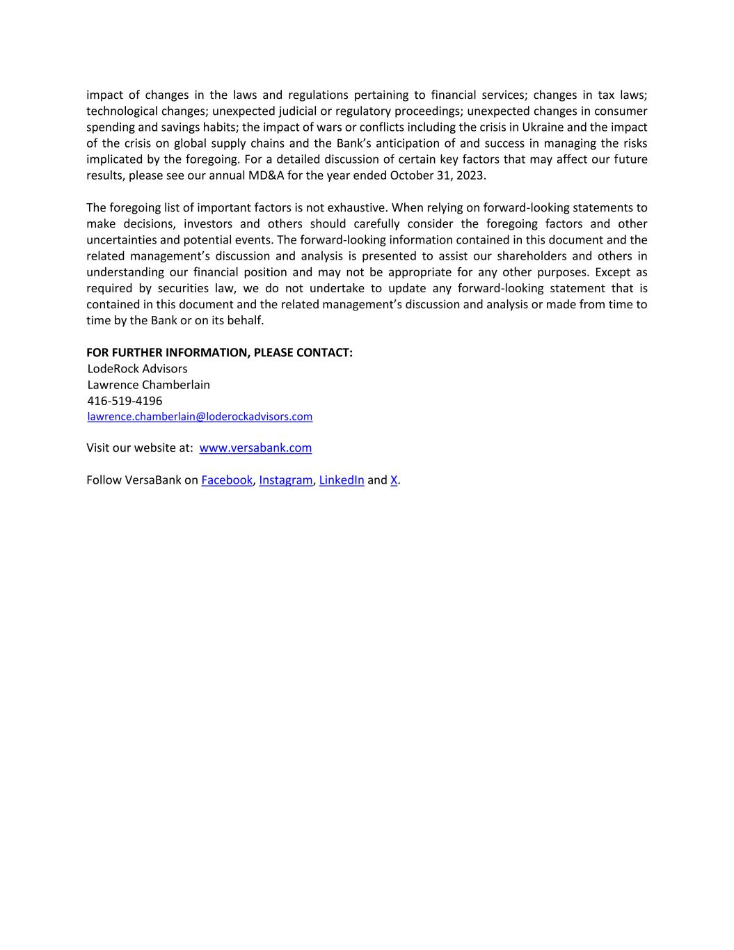 impact of changes in the laws and regulations pertaining to financial services; changes in tax laws; technological changes; unexpected judicial or regulatory proceedings; unexpected changes in consumer spending and savings habits; the impact of wars or conflicts including the crisis in Ukraine and the impact of the crisis on global supply chains and the Bank’s anticipation of and success in managing the risks implicated by the foregoing. For a detailed discussion of certain key factors that may affect our future results, please see our annual MD&A for the year ended October 31, 2023. The foregoing list of important factors is not exhaustive. When relying on forward-looking statements to make decisions, investors and others should carefully consider the foregoing factors and other uncertainties and potential events. The forward-looking information contained in this document and the related management’s discussion and analysis is presented to assist our shareholders and others in understanding our financial position and may not be appropriate for any other purposes. Except as required by securities law, we do not undertake to update any forward-looking statement that is contained in this document and the related management’s discussion and analysis or made from time to time by the Bank or on its behalf. FOR FURTHER INFORMATION, PLEASE CONTACT: LodeRock Advisors Lawrence Chamberlain 416-519-4196 lawrence.chamberlain@loderockadvisors.com Visit our website at: www.versabank.com Follow VersaBank on Facebook, Instagram, LinkedIn and X.