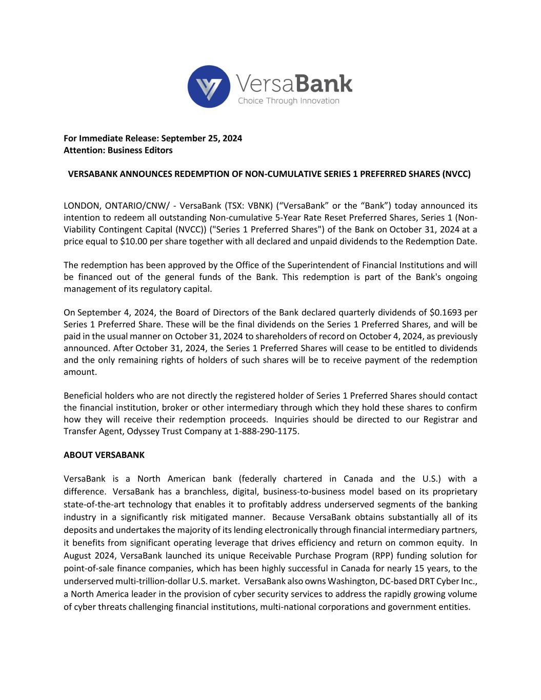 For Immediate Release: September 25, 2024 Attention: Business Editors VERSABANK ANNOUNCES REDEMPTION OF NON-CUMULATIVE SERIES 1 PREFERRED SHARES (NVCC) LONDON, ONTARIO/CNW/ - VersaBank (TSX: VBNK) (“VersaBank” or the “Bank”) today announced its intention to redeem all outstanding Non-cumulative 5-Year Rate Reset Preferred Shares, Series 1 (Non- Viability Contingent Capital (NVCC)) ("Series 1 Preferred Shares") of the Bank on October 31, 2024 at a price equal to $10.00 per share together with all declared and unpaid dividends to the Redemption Date. The redemption has been approved by the Office of the Superintendent of Financial Institutions and will be financed out of the general funds of the Bank. This redemption is part of the Bank's ongoing management of its regulatory capital. On September 4, 2024, the Board of Directors of the Bank declared quarterly dividends of $0.1693 per Series 1 Preferred Share. These will be the final dividends on the Series 1 Preferred Shares, and will be paid in the usual manner on October 31, 2024 to shareholders of record on October 4, 2024, as previously announced. After October 31, 2024, the Series 1 Preferred Shares will cease to be entitled to dividends and the only remaining rights of holders of such shares will be to receive payment of the redemption amount. Beneficial holders who are not directly the registered holder of Series 1 Preferred Shares should contact the financial institution, broker or other intermediary through which they hold these shares to confirm how they will receive their redemption proceeds. Inquiries should be directed to our Registrar and Transfer Agent, Odyssey Trust Company at 1-888-290-1175. ABOUT VERSABANK VersaBank is a North American bank (federally chartered in Canada and the U.S.) with a difference. VersaBank has a branchless, digital, business-to-business model based on its proprietary state-of-the-art technology that enables it to profitably address underserved segments of the banking industry in a significantly risk mitigated manner. Because VersaBank obtains substantially all of its deposits and undertakes the majority of its lending electronically through financial intermediary partners, it benefits from significant operating leverage that drives efficiency and return on common equity. In August 2024, VersaBank launched its unique Receivable Purchase Program (RPP) funding solution for point-of-sale finance companies, which has been highly successful in Canada for nearly 15 years, to the underserved multi-trillion-dollar U.S. market. VersaBank also owns Washington, DC-based DRT Cyber Inc., a North America leader in the provision of cyber security services to address the rapidly growing volume of cyber threats challenging financial institutions, multi-national corporations and government entities.