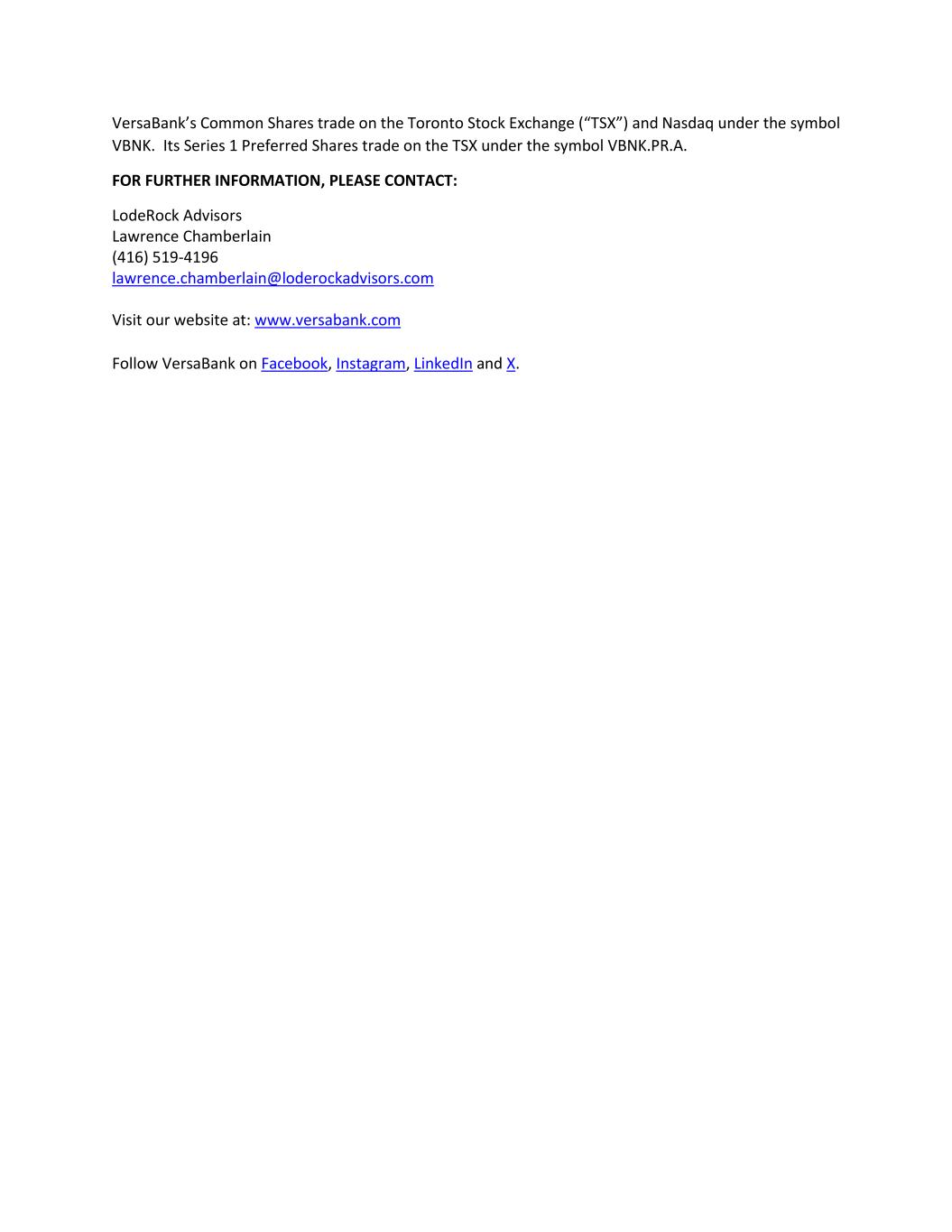 VersaBank’s Common Shares trade on the Toronto Stock Exchange (“TSX”) and Nasdaq under the symbol VBNK. Its Series 1 Preferred Shares trade on the TSX under the symbol VBNK.PR.A. FOR FURTHER INFORMATION, PLEASE CONTACT: LodeRock Advisors Lawrence Chamberlain (416) 519-4196 lawrence.chamberlain@loderockadvisors.com Visit our website at: www.versabank.com Follow VersaBank on Facebook, Instagram, LinkedIn and X.