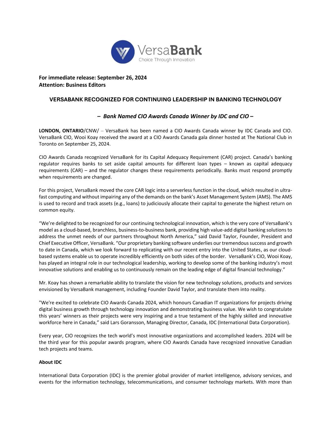 For immediate release: September 26, 2024 Attention: Business Editors VERSABANK RECOGNIZED FOR CONTINUING LEADERSHIP IN BANKING TECHNOLOGY – Bank Named CIO Awards Canada Winner by IDC and CIO – LONDON, ONTARIO/CNW/ – VersaBank has been named a CIO Awards Canada winner by IDC Canada and CIO. VersaBank CIO, Wooi Koay received the award at a CIO Awards Canada gala dinner hosted at The National Club in Toronto on September 25, 2024. CIO Awards Canada recognized VersaBank for its Capital Adequacy Requirement (CAR) project. Canada’s banking regulator requires banks to set aside capital amounts for different loan types – known as capital adequacy requirements (CAR) – and the regulator changes these requirements periodically. Banks must respond promptly when requirements are changed. For this project, VersaBank moved the core CAR logic into a serverless function in the cloud, which resulted in ultra- fast computing and without impairing any of the demands on the bank’s Asset Management System (AMS). The AMS is used to record and track assets (e.g., loans) to judiciously allocate their capital to generate the highest return on common equity. “We’re delighted to be recognized for our continuing technological innovation, which is the very core of VersaBank’s model as a cloud-based, branchless, business-to-business bank, providing high value-add digital banking solutions to address the unmet needs of our partners throughout North America,” said David Taylor, Founder, President and Chief Executive Officer, VersaBank. “Our proprietary banking software underlies our tremendous success and growth to date in Canada, which we look forward to replicating with our recent entry into the United States, as our cloud- based systems enable us to operate incredibly efficiently on both sides of the border. VersaBank’s CIO, Wooi Koay, has played an integral role in our technological leadership, working to develop some of the banking industry’s most innovative solutions and enabling us to continuously remain on the leading edge of digital financial technology.” Mr. Koay has shown a remarkable ability to translate the vision for new technology solutions, products and services envisioned by VersaBank management, including Founder David Taylor, and translate them into reality. "We're excited to celebrate CIO Awards Canada 2024, which honours Canadian IT organizations for projects driving digital business growth through technology innovation and demonstrating business value. We wish to congratulate this years’ winners as their projects were very inspiring and a true testament of the highly skilled and innovative workforce here in Canada,” said Lars Goransson, Managing Director, Canada, IDC (International Data Corporation). Every year, CIO recognizes the tech world’s most innovative organizations and accomplished leaders. 2024 will be the third year for this popular awards program, where CIO Awards Canada have recognized innovative Canadian tech projects and teams. About IDC International Data Corporation (IDC) is the premier global provider of market intelligence, advisory services, and events for the information technology, telecommunications, and consumer technology markets. With more than