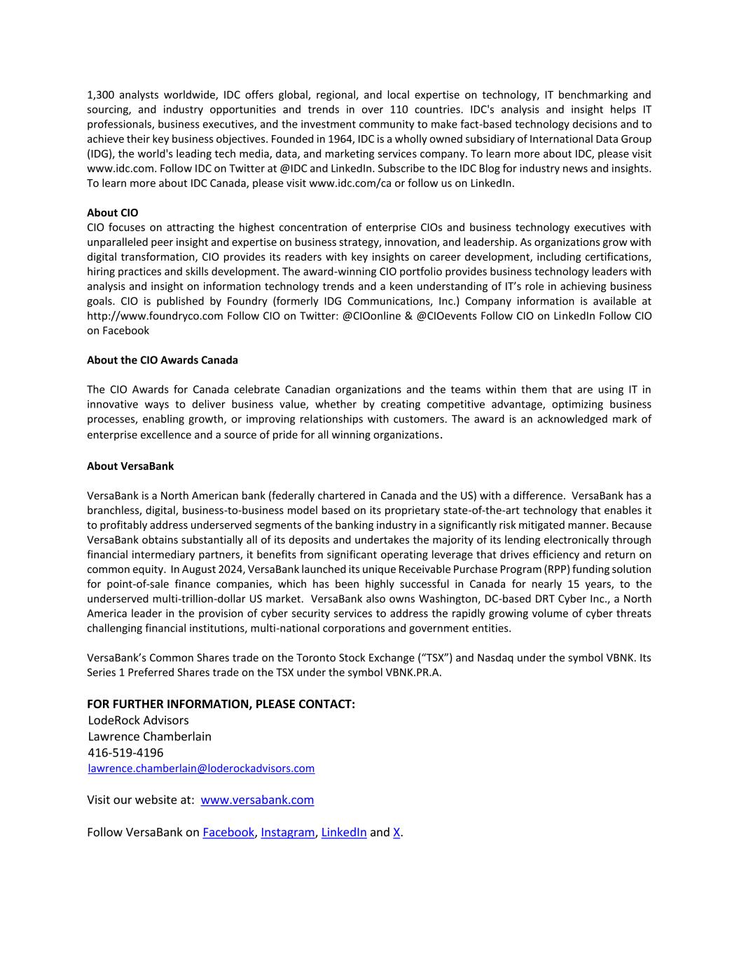 1,300 analysts worldwide, IDC offers global, regional, and local expertise on technology, IT benchmarking and sourcing, and industry opportunities and trends in over 110 countries. IDC's analysis and insight helps IT professionals, business executives, and the investment community to make fact-based technology decisions and to achieve their key business objectives. Founded in 1964, IDC is a wholly owned subsidiary of International Data Group (IDG), the world's leading tech media, data, and marketing services company. To learn more about IDC, please visit www.idc.com. Follow IDC on Twitter at @IDC and LinkedIn. Subscribe to the IDC Blog for industry news and insights. To learn more about IDC Canada, please visit www.idc.com/ca or follow us on LinkedIn. About CIO CIO focuses on attracting the highest concentration of enterprise CIOs and business technology executives with unparalleled peer insight and expertise on business strategy, innovation, and leadership. As organizations grow with digital transformation, CIO provides its readers with key insights on career development, including certifications, hiring practices and skills development. The award-winning CIO portfolio provides business technology leaders with analysis and insight on information technology trends and a keen understanding of IT’s role in achieving business goals. CIO is published by Foundry (formerly IDG Communications, Inc.) Company information is available at http://www.foundryco.com Follow CIO on Twitter: @CIOonline & @CIOevents Follow CIO on LinkedIn Follow CIO on Facebook About the CIO Awards Canada The CIO Awards for Canada celebrate Canadian organizations and the teams within them that are using IT in innovative ways to deliver business value, whether by creating competitive advantage, optimizing business processes, enabling growth, or improving relationships with customers. The award is an acknowledged mark of enterprise excellence and a source of pride for all winning organizations. About VersaBank VersaBank is a North American bank (federally chartered in Canada and the US) with a difference. VersaBank has a branchless, digital, business-to-business model based on its proprietary state-of-the-art technology that enables it to profitably address underserved segments of the banking industry in a significantly risk mitigated manner. Because VersaBank obtains substantially all of its deposits and undertakes the majority of its lending electronically through financial intermediary partners, it benefits from significant operating leverage that drives efficiency and return on common equity. In August 2024, VersaBank launched its unique Receivable Purchase Program (RPP) funding solution for point-of-sale finance companies, which has been highly successful in Canada for nearly 15 years, to the underserved multi-trillion-dollar US market. VersaBank also owns Washington, DC-based DRT Cyber Inc., a North America leader in the provision of cyber security services to address the rapidly growing volume of cyber threats challenging financial institutions, multi-national corporations and government entities. VersaBank’s Common Shares trade on the Toronto Stock Exchange (“TSX”) and Nasdaq under the symbol VBNK. Its Series 1 Preferred Shares trade on the TSX under the symbol VBNK.PR.A. FOR FURTHER INFORMATION, PLEASE CONTACT: LodeRock Advisors Lawrence Chamberlain 416-519-4196 lawrence.chamberlain@loderockadvisors.com Visit our website at: www.versabank.com Follow VersaBank on Facebook, Instagram, LinkedIn and X.
