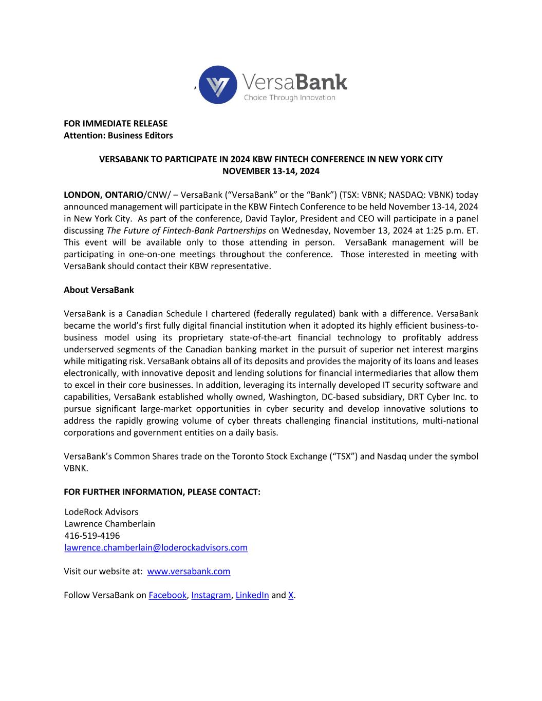 , FOR IMMEDIATE RELEASE Attention: Business Editors VERSABANK TO PARTICIPATE IN 2024 KBW FINTECH CONFERENCE IN NEW YORK CITY NOVEMBER 13-14, 2024 LONDON, ONTARIO/CNW/ – VersaBank (“VersaBank” or the “Bank”) (TSX: VBNK; NASDAQ: VBNK) today announced management will participate in the KBW Fintech Conference to be held November 13-14, 2024 in New York City. As part of the conference, David Taylor, President and CEO will participate in a panel discussing The Future of Fintech-Bank Partnerships on Wednesday, November 13, 2024 at 1:25 p.m. ET. This event will be available only to those attending in person. VersaBank management will be participating in one-on-one meetings throughout the conference. Those interested in meeting with VersaBank should contact their KBW representative. About VersaBank VersaBank is a Canadian Schedule I chartered (federally regulated) bank with a difference. VersaBank became the world’s first fully digital financial institution when it adopted its highly efficient business-to- business model using its proprietary state-of-the-art financial technology to profitably address underserved segments of the Canadian banking market in the pursuit of superior net interest margins while mitigating risk. VersaBank obtains all of its deposits and provides the majority of its loans and leases electronically, with innovative deposit and lending solutions for financial intermediaries that allow them to excel in their core businesses. In addition, leveraging its internally developed IT security software and capabilities, VersaBank established wholly owned, Washington, DC-based subsidiary, DRT Cyber Inc. to pursue significant large-market opportunities in cyber security and develop innovative solutions to address the rapidly growing volume of cyber threats challenging financial institutions, multi-national corporations and government entities on a daily basis. VersaBank’s Common Shares trade on the Toronto Stock Exchange (“TSX”) and Nasdaq under the symbol VBNK. FOR FURTHER INFORMATION, PLEASE CONTACT: LodeRock Advisors Lawrence Chamberlain 416-519-4196 lawrence.chamberlain@loderockadvisors.com Visit our website at: www.versabank.com Follow VersaBank on Facebook, Instagram, LinkedIn and X.
