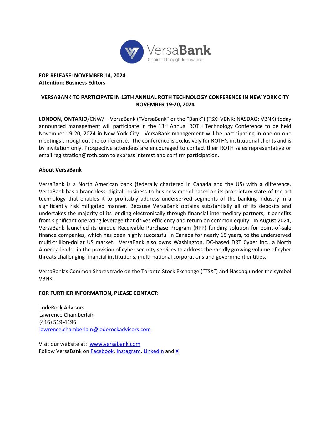 FOR RELEASE: NOVEMBER 14, 2024 Attention: Business Editors VERSABANK TO PARTICIPATE IN 13TH ANNUAL ROTH TECHNOLOGY CONFERENCE IN NEW YORK CITY NOVEMBER 19-20, 2024 LONDON, ONTARIO/CNW/ – VersaBank (“VersaBank” or the “Bank”) (TSX: VBNK; NASDAQ: VBNK) today announced management will participate in the 13th Annual ROTH Technology Conference to be held November 19-20, 2024 in New York City. VersaBank management will be participating in one-on-one meetings throughout the conference. The conference is exclusively for ROTH’s institutional clients and is by invitation only. Prospective attendees are encouraged to contact their ROTH sales representative or email registration@roth.com to express interest and confirm participation. About VersaBank VersaBank is a North American bank (federally chartered in Canada and the US) with a difference. VersaBank has a branchless, digital, business-to-business model based on its proprietary state-of-the-art technology that enables it to profitably address underserved segments of the banking industry in a significantly risk mitigated manner. Because VersaBank obtains substantially all of its deposits and undertakes the majority of its lending electronically through financial intermediary partners, it benefits from significant operating leverage that drives efficiency and return on common equity. In August 2024, VersaBank launched its unique Receivable Purchase Program (RPP) funding solution for point-of-sale finance companies, which has been highly successful in Canada for nearly 15 years, to the underserved multi-trillion-dollar US market. VersaBank also owns Washington, DC-based DRT Cyber Inc., a North America leader in the provision of cyber security services to address the rapidly growing volume of cyber threats challenging financial institutions, multi-national corporations and government entities. VersaBank’s Common Shares trade on the Toronto Stock Exchange (“TSX”) and Nasdaq under the symbol VBNK. FOR FURTHER INFORMATION, PLEASE CONTACT: LodeRock Advisors Lawrence Chamberlain (416) 519-4196 lawrence.chamberlain@loderockadvisors.com Visit our website at: www.versabank.com Follow VersaBank on Facebook, Instagram, LinkedIn and X