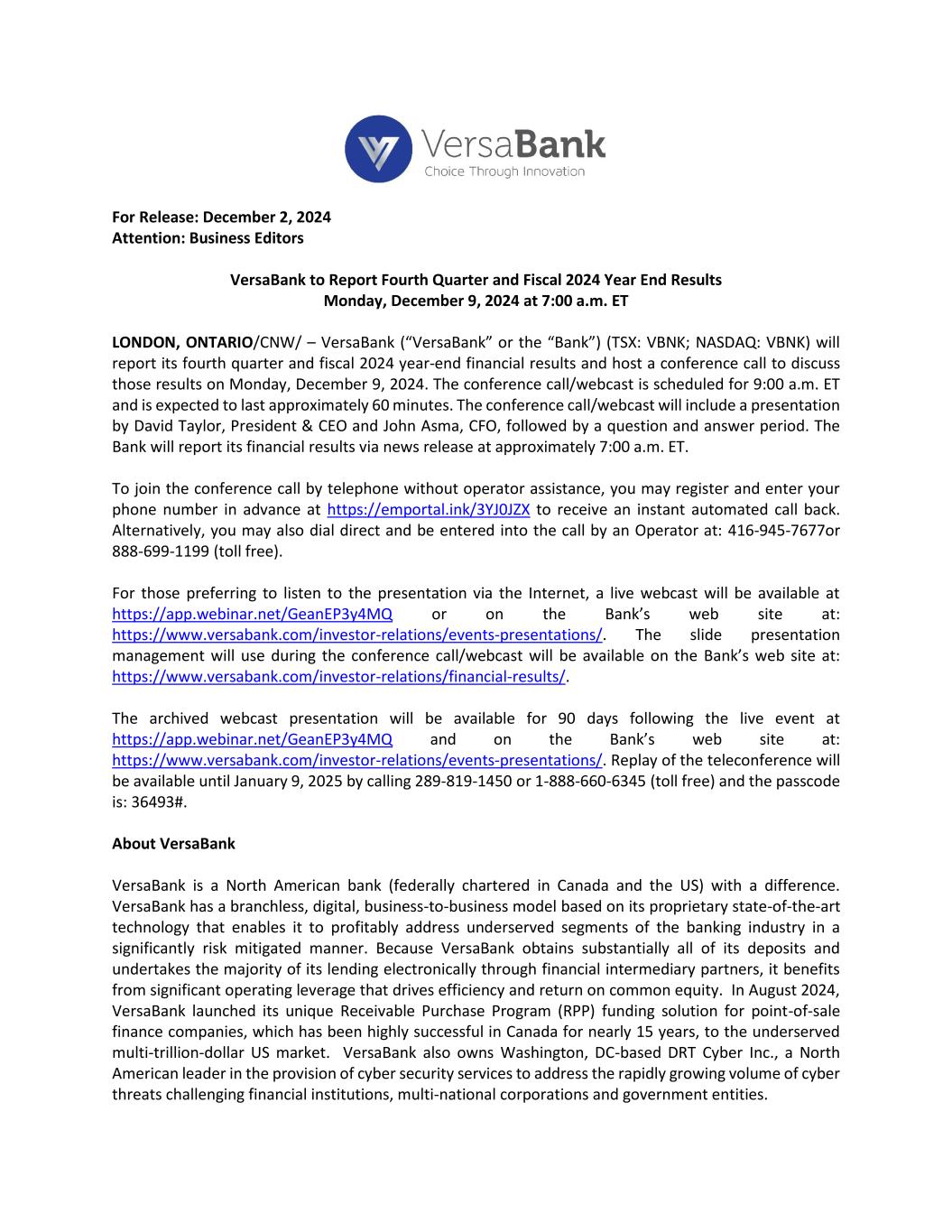 For Release: December 2, 2024 Attention: Business Editors VersaBank to Report Fourth Quarter and Fiscal 2024 Year End Results Monday, December 9, 2024 at 7:00 a.m. ET LONDON, ONTARIO/CNW/ – VersaBank (“VersaBank” or the “Bank”) (TSX: VBNK; NASDAQ: VBNK) will report its fourth quarter and fiscal 2024 year-end financial results and host a conference call to discuss those results on Monday, December 9, 2024. The conference call/webcast is scheduled for 9:00 a.m. ET and is expected to last approximately 60 minutes. The conference call/webcast will include a presentation by David Taylor, President & CEO and John Asma, CFO, followed by a question and answer period. The Bank will report its financial results via news release at approximately 7:00 a.m. ET. To join the conference call by telephone without operator assistance, you may register and enter your phone number in advance at https://emportal.ink/3YJ0JZX to receive an instant automated call back. Alternatively, you may also dial direct and be entered into the call by an Operator at: 416-945-7677or 888-699-1199 (toll free). For those preferring to listen to the presentation via the Internet, a live webcast will be available at https://app.webinar.net/GeanEP3y4MQ or on the Bank’s web site at: https://www.versabank.com/investor-relations/events-presentations/. The slide presentation management will use during the conference call/webcast will be available on the Bank’s web site at: https://www.versabank.com/investor-relations/financial-results/. The archived webcast presentation will be available for 90 days following the live event at https://app.webinar.net/GeanEP3y4MQ and on the Bank’s web site at: https://www.versabank.com/investor-relations/events-presentations/. Replay of the teleconference will be available until January 9, 2025 by calling 289-819-1450 or 1-888-660-6345 (toll free) and the passcode is: 36493#. About VersaBank VersaBank is a North American bank (federally chartered in Canada and the US) with a difference. VersaBank has a branchless, digital, business-to-business model based on its proprietary state-of-the-art technology that enables it to profitably address underserved segments of the banking industry in a significantly risk mitigated manner. Because VersaBank obtains substantially all of its deposits and undertakes the majority of its lending electronically through financial intermediary partners, it benefits from significant operating leverage that drives efficiency and return on common equity. In August 2024, VersaBank launched its unique Receivable Purchase Program (RPP) funding solution for point-of-sale finance companies, which has been highly successful in Canada for nearly 15 years, to the underserved multi-trillion-dollar US market. VersaBank also owns Washington, DC-based DRT Cyber Inc., a North American leader in the provision of cyber security services to address the rapidly growing volume of cyber threats challenging financial institutions, multi-national corporations and government entities.
