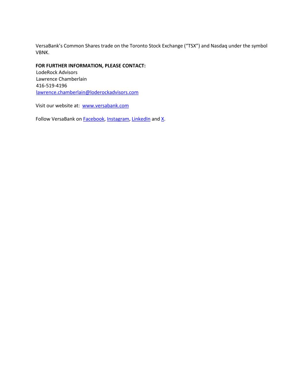 VersaBank’s Common Shares trade on the Toronto Stock Exchange (“TSX”) and Nasdaq under the symbol VBNK. FOR FURTHER INFORMATION, PLEASE CONTACT: LodeRock Advisors Lawrence Chamberlain 416-519-4196 lawrence.chamberlain@loderockadvisors.com Visit our website at: www.versabank.com Follow VersaBank on Facebook, Instagram, LinkedIn and X.