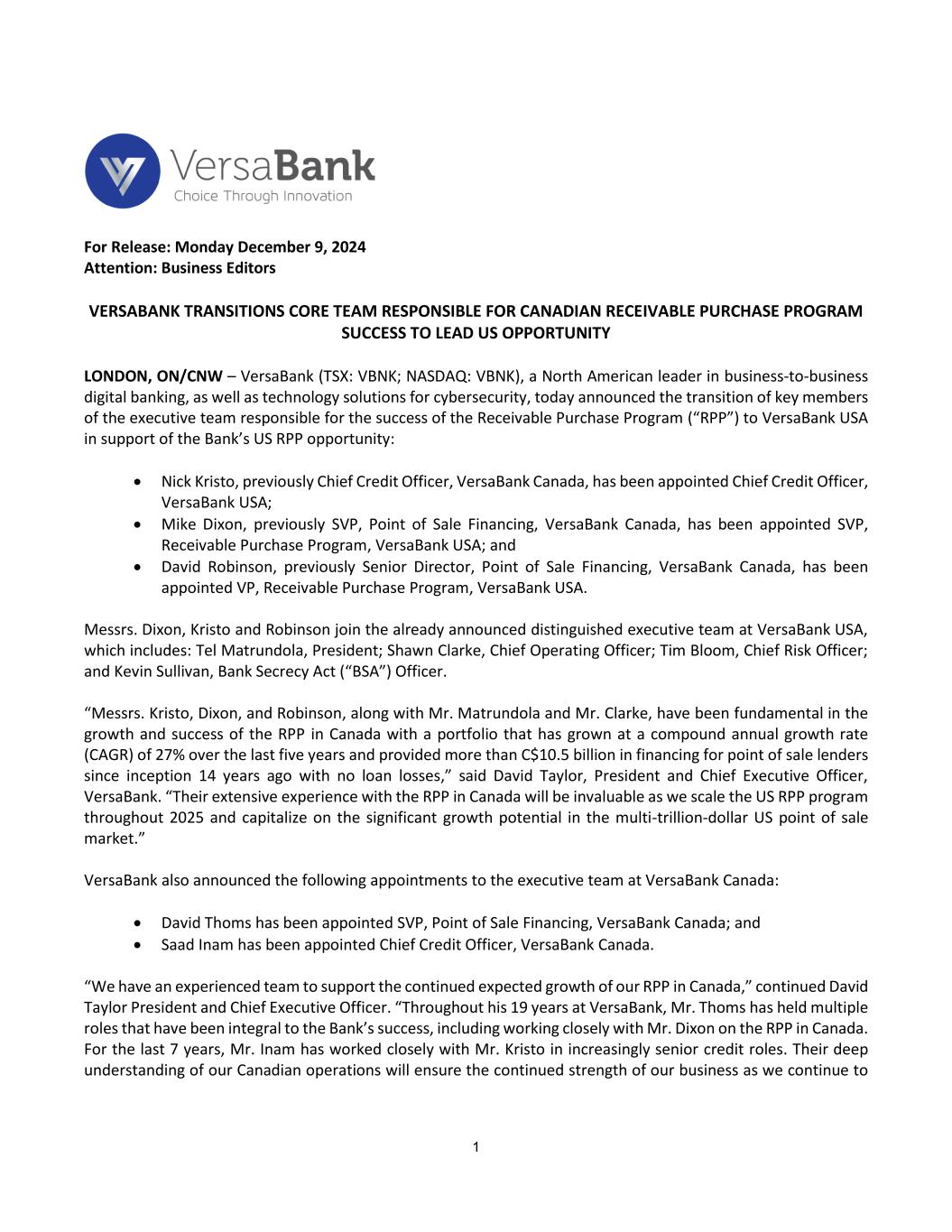 1 For Release: Monday December 9, 2024 Attention: Business Editors VERSABANK TRANSITIONS CORE TEAM RESPONSIBLE FOR CANADIAN RECEIVABLE PURCHASE PROGRAM SUCCESS TO LEAD US OPPORTUNITY LONDON, ON/CNW – VersaBank (TSX: VBNK; NASDAQ: VBNK), a North American leader in business-to-business digital banking, as well as technology solutions for cybersecurity, today announced the transition of key members of the executive team responsible for the success of the Receivable Purchase Program (“RPP”) to VersaBank USA in support of the Bank’s US RPP opportunity: • Nick Kristo, previously Chief Credit Officer, VersaBank Canada, has been appointed Chief Credit Officer, VersaBank USA; • Mike Dixon, previously SVP, Point of Sale Financing, VersaBank Canada, has been appointed SVP, Receivable Purchase Program, VersaBank USA; and • David Robinson, previously Senior Director, Point of Sale Financing, VersaBank Canada, has been appointed VP, Receivable Purchase Program, VersaBank USA. Messrs. Dixon, Kristo and Robinson join the already announced distinguished executive team at VersaBank USA, which includes: Tel Matrundola, President; Shawn Clarke, Chief Operating Officer; Tim Bloom, Chief Risk Officer; and Kevin Sullivan, Bank Secrecy Act (“BSA”) Officer. “Messrs. Kristo, Dixon, and Robinson, along with Mr. Matrundola and Mr. Clarke, have been fundamental in the growth and success of the RPP in Canada with a portfolio that has grown at a compound annual growth rate (CAGR) of 27% over the last five years and provided more than C$10.5 billion in financing for point of sale lenders since inception 14 years ago with no loan losses,” said David Taylor, President and Chief Executive Officer, VersaBank. “Their extensive experience with the RPP in Canada will be invaluable as we scale the US RPP program throughout 2025 and capitalize on the significant growth potential in the multi-trillion-dollar US point of sale market.” VersaBank also announced the following appointments to the executive team at VersaBank Canada: • David Thoms has been appointed SVP, Point of Sale Financing, VersaBank Canada; and • Saad Inam has been appointed Chief Credit Officer, VersaBank Canada. “We have an experienced team to support the continued expected growth of our RPP in Canada,” continued David Taylor President and Chief Executive Officer. “Throughout his 19 years at VersaBank, Mr. Thoms has held multiple roles that have been integral to the Bank’s success, including working closely with Mr. Dixon on the RPP in Canada. For the last 7 years, Mr. Inam has worked closely with Mr. Kristo in increasingly senior credit roles. Their deep understanding of our Canadian operations will ensure the continued strength of our business as we continue to
