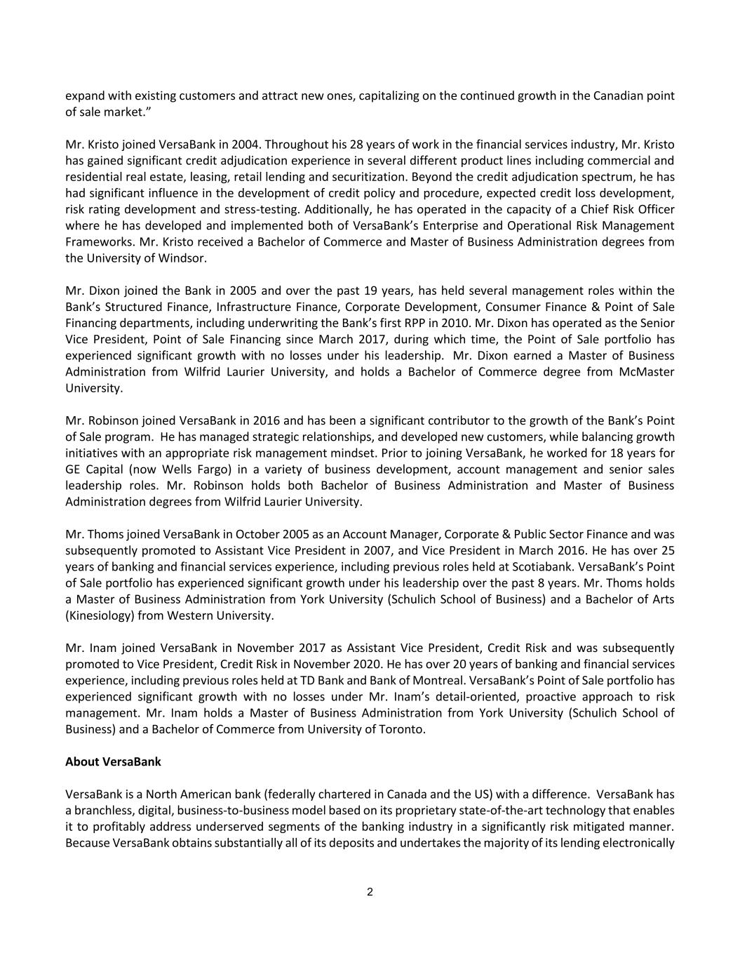 2 expand with existing customers and attract new ones, capitalizing on the continued growth in the Canadian point of sale market.” Mr. Kristo joined VersaBank in 2004. Throughout his 28 years of work in the financial services industry, Mr. Kristo has gained significant credit adjudication experience in several different product lines including commercial and residential real estate, leasing, retail lending and securitization. Beyond the credit adjudication spectrum, he has had significant influence in the development of credit policy and procedure, expected credit loss development, risk rating development and stress-testing. Additionally, he has operated in the capacity of a Chief Risk Officer where he has developed and implemented both of VersaBank’s Enterprise and Operational Risk Management Frameworks. Mr. Kristo received a Bachelor of Commerce and Master of Business Administration degrees from the University of Windsor. Mr. Dixon joined the Bank in 2005 and over the past 19 years, has held several management roles within the Bank’s Structured Finance, Infrastructure Finance, Corporate Development, Consumer Finance & Point of Sale Financing departments, including underwriting the Bank’s first RPP in 2010. Mr. Dixon has operated as the Senior Vice President, Point of Sale Financing since March 2017, during which time, the Point of Sale portfolio has experienced significant growth with no losses under his leadership. Mr. Dixon earned a Master of Business Administration from Wilfrid Laurier University, and holds a Bachelor of Commerce degree from McMaster University. Mr. Robinson joined VersaBank in 2016 and has been a significant contributor to the growth of the Bank’s Point of Sale program. He has managed strategic relationships, and developed new customers, while balancing growth initiatives with an appropriate risk management mindset. Prior to joining VersaBank, he worked for 18 years for GE Capital (now Wells Fargo) in a variety of business development, account management and senior sales leadership roles. Mr. Robinson holds both Bachelor of Business Administration and Master of Business Administration degrees from Wilfrid Laurier University. Mr. Thoms joined VersaBank in October 2005 as an Account Manager, Corporate & Public Sector Finance and was subsequently promoted to Assistant Vice President in 2007, and Vice President in March 2016. He has over 25 years of banking and financial services experience, including previous roles held at Scotiabank. VersaBank’s Point of Sale portfolio has experienced significant growth under his leadership over the past 8 years. Mr. Thoms holds a Master of Business Administration from York University (Schulich School of Business) and a Bachelor of Arts (Kinesiology) from Western University. Mr. Inam joined VersaBank in November 2017 as Assistant Vice President, Credit Risk and was subsequently promoted to Vice President, Credit Risk in November 2020. He has over 20 years of banking and financial services experience, including previous roles held at TD Bank and Bank of Montreal. VersaBank’s Point of Sale portfolio has experienced significant growth with no losses under Mr. Inam’s detail-oriented, proactive approach to risk management. Mr. Inam holds a Master of Business Administration from York University (Schulich School of Business) and a Bachelor of Commerce from University of Toronto. About VersaBank VersaBank is a North American bank (federally chartered in Canada and the US) with a difference. VersaBank has a branchless, digital, business-to-business model based on its proprietary state-of-the-art technology that enables it to profitably address underserved segments of the banking industry in a significantly risk mitigated manner. Because VersaBank obtains substantially all of its deposits and undertakes the majority of its lending electronically