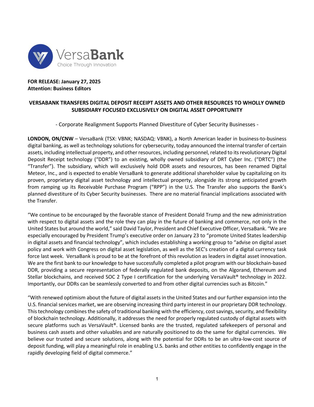 1 FOR RELEASE: January 27, 2025 Attention: Business Editors VERSABANK TRANSFERS DIGITAL DEPOSIT RECEIPT ASSETS AND OTHER RESOURCES TO WHOLLY OWNED SUBSIDIARY FOCUSED EXCLUSIVELY ON DIGITAL ASSET OPPORTUNITY - Corporate Realignment Supports Planned Divestiture of Cyber Security Businesses - LONDON, ON/CNW – VersaBank (TSX: VBNK; NASDAQ: VBNK), a North American leader in business-to-business digital banking, as well as technology solutions for cybersecurity, today announced the internal transfer of certain assets, including intellectual property, and other resources, including personnel, related to its revolutionary Digital Deposit Receipt technology (“DDR”) to an existing, wholly owned subsidiary of DRT Cyber Inc. (“DRTC”) (the “Transfer”). The subsidiary, which will exclusively hold DDR assets and resources, has been renamed Digital Meteor, Inc., and is expected to enable VersaBank to generate additional shareholder value by capitalizing on its proven, proprietary digital asset technology and intellectual property, alongside its strong anticipated growth from ramping up its Receivable Purchase Program (“RPP”) in the U.S. The Transfer also supports the Bank’s planned divestiture of its Cyber Security businesses. There are no material financial implications associated with the Transfer. “We continue to be encouraged by the favorable stance of President Donald Trump and the new administration with respect to digital assets and the role they can play in the future of banking and commerce, not only in the United States but around the world,” said David Taylor, President and Chief Executive Officer, VersaBank. “We are especially encouraged by President Trump’s executive order on January 23 to “promote United States leadership in digital assets and financial technology”, which includes establishing a working group to “advise on digital asset policy and work with Congress on digital asset legislation, as well as the SEC’s creation of a digital currency task force last week. VersaBank is proud to be at the forefront of this revolution as leaders in digital asset innovation. We are the first bank to our knowledge to have successfully completed a pilot program with our blockchain-based DDR, providing a secure representation of federally regulated bank deposits, on the Algorand, Ethereum and Stellar blockchains, and received SOC 2 Type I certification for the underlying VersaVault® technology in 2022. Importantly, our DDRs can be seamlessly converted to and from other digital currencies such as Bitcoin.” “With renewed optimism about the future of digital assets in the United States and our further expansion into the U.S. financial services market, we are observing increasing third party interest in our proprietary DDR technology. This technology combines the safety of traditional banking with the efficiency, cost savings, security, and flexibility of blockchain technology. Additionally, it addresses the need for properly regulated custody of digital assets with secure platforms such as VersaVault®. Licensed banks are the trusted, regulated safekeepers of personal and business cash assets and other valuables and are naturally positioned to do the same for digital currencies. We believe our trusted and secure solutions, along with the potential for DDRs to be an ultra-low-cost source of deposit funding, will play a meaningful role in enabling U.S. banks and other entities to confidently engage in the rapidly developing field of digital commerce.”