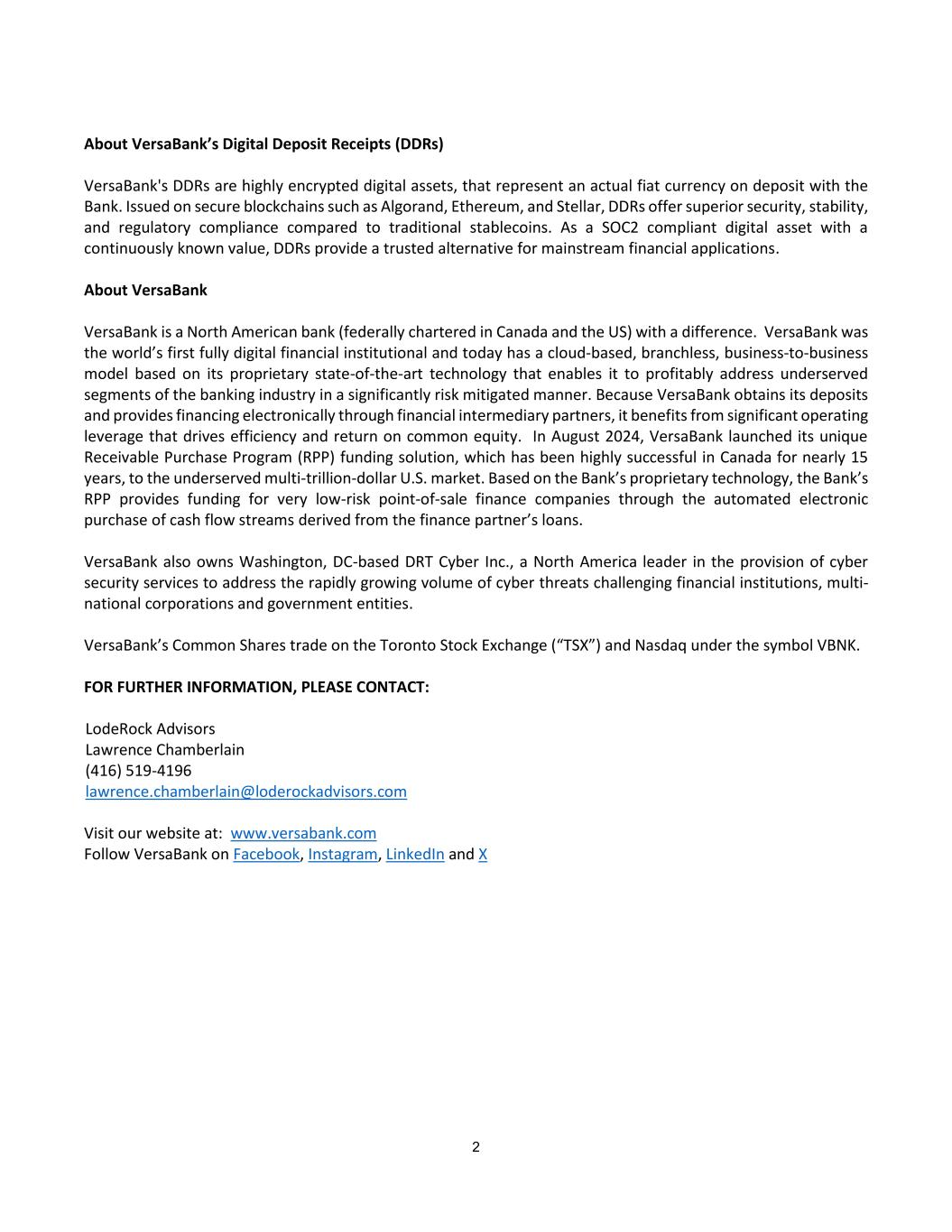 2 About VersaBank’s Digital Deposit Receipts (DDRs) VersaBank's DDRs are highly encrypted digital assets, that represent an actual fiat currency on deposit with the Bank. Issued on secure blockchains such as Algorand, Ethereum, and Stellar, DDRs offer superior security, stability, and regulatory compliance compared to traditional stablecoins. As a SOC2 compliant digital asset with a continuously known value, DDRs provide a trusted alternative for mainstream financial applications. About VersaBank VersaBank is a North American bank (federally chartered in Canada and the US) with a difference. VersaBank was the world’s first fully digital financial institutional and today has a cloud-based, branchless, business-to-business model based on its proprietary state-of-the-art technology that enables it to profitably address underserved segments of the banking industry in a significantly risk mitigated manner. Because VersaBank obtains its deposits and provides financing electronically through financial intermediary partners, it benefits from significant operating leverage that drives efficiency and return on common equity. In August 2024, VersaBank launched its unique Receivable Purchase Program (RPP) funding solution, which has been highly successful in Canada for nearly 15 years, to the underserved multi-trillion-dollar U.S. market. Based on the Bank’s proprietary technology, the Bank’s RPP provides funding for very low-risk point-of-sale finance companies through the automated electronic purchase of cash flow streams derived from the finance partner’s loans. VersaBank also owns Washington, DC-based DRT Cyber Inc., a North America leader in the provision of cyber security services to address the rapidly growing volume of cyber threats challenging financial institutions, multi- national corporations and government entities. VersaBank’s Common Shares trade on the Toronto Stock Exchange (“TSX”) and Nasdaq under the symbol VBNK. FOR FURTHER INFORMATION, PLEASE CONTACT: LodeRock Advisors Lawrence Chamberlain (416) 519-4196 lawrence.chamberlain@loderockadvisors.com Visit our website at: www.versabank.com Follow VersaBank on Facebook, Instagram, LinkedIn and X