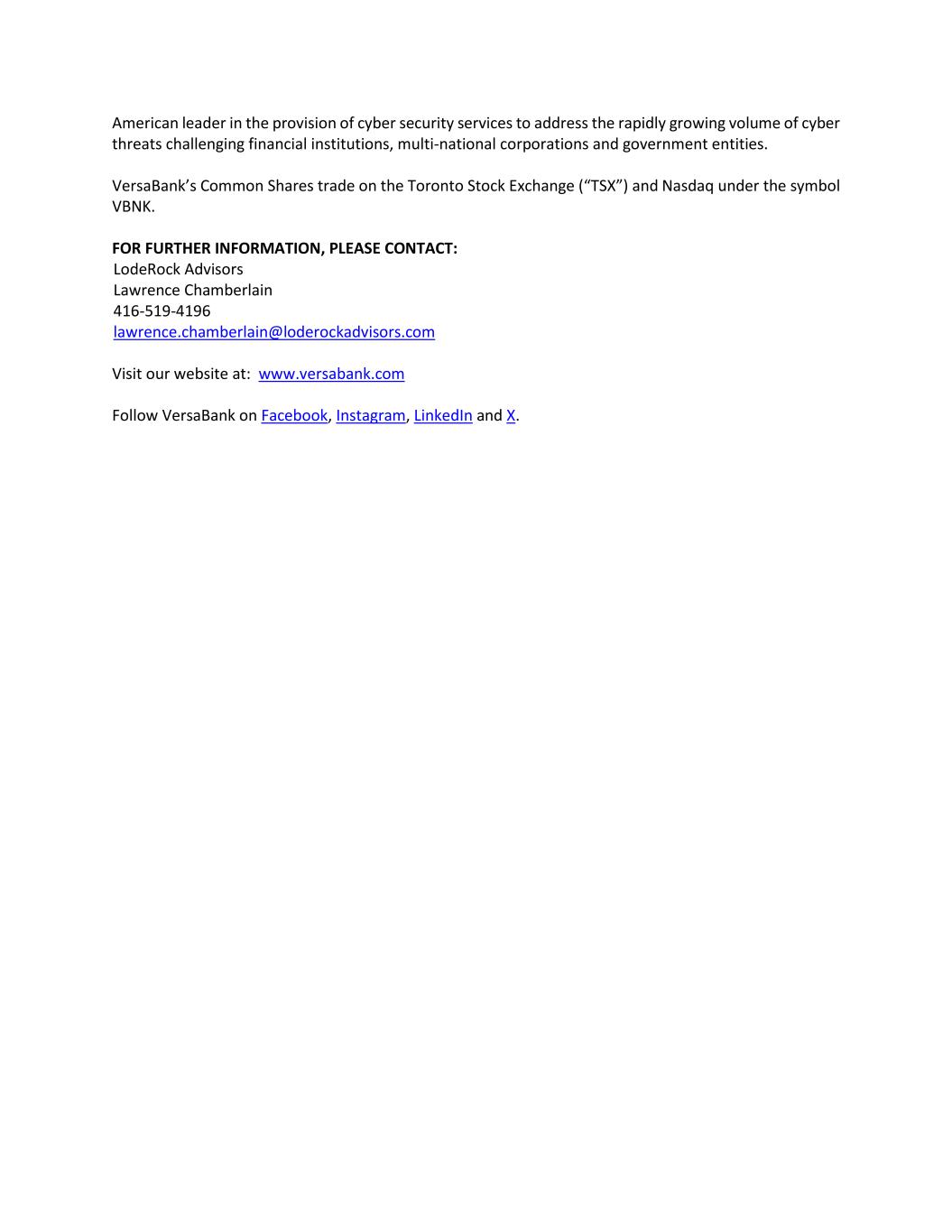 American leader in the provision of cyber security services to address the rapidly growing volume of cyber threats challenging financial institutions, multi-national corporations and government entities. VersaBank’s Common Shares trade on the Toronto Stock Exchange (“TSX”) and Nasdaq under the symbol VBNK. FOR FURTHER INFORMATION, PLEASE CONTACT: LodeRock Advisors Lawrence Chamberlain 416-519-4196 lawrence.chamberlain@loderockadvisors.com Visit our website at: www.versabank.com Follow VersaBank on Facebook, Instagram, LinkedIn and X.