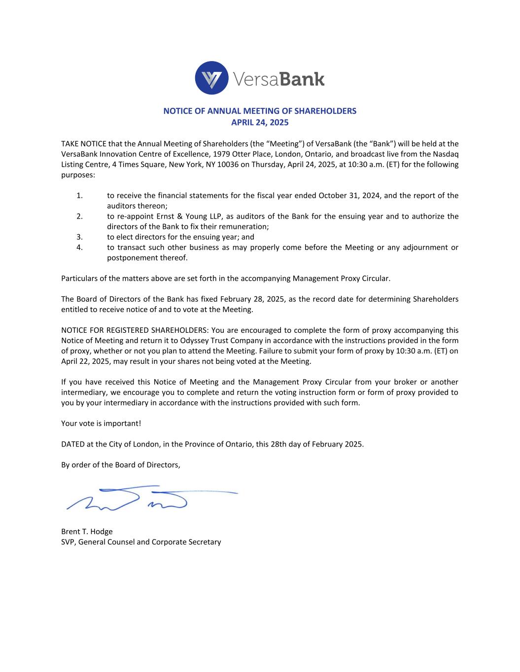 NOTICE OF ANNUAL MEETING OF SHAREHOLDERS APRIL 24, 2025 TAKE NOTICE that the Annual Meeting of Shareholders (the “Meeting”) of VersaBank (the “Bank”) will be held at the VersaBank Innovation Centre of Excellence, 1979 Otter Place, London, Ontario, and broadcast live from the Nasdaq Listing Centre, 4 Times Square, New York, NY 10036 on Thursday, April 24, 2025, at 10:30 a.m. (ET) for the following purposes: 1. to receive the financial statements for the fiscal year ended October 31, 2024, and the report of the auditors thereon; 2. to re-appoint Ernst & Young LLP, as auditors of the Bank for the ensuing year and to authorize the directors of the Bank to fix their remuneration; 3. to elect directors for the ensuing year; and 4. to transact such other business as may properly come before the Meeting or any adjournment or postponement thereof. Particulars of the matters above are set forth in the accompanying Management Proxy Circular. The Board of Directors of the Bank has fixed February 28, 2025, as the record date for determining Shareholders entitled to receive notice of and to vote at the Meeting. NOTICE FOR REGISTERED SHAREHOLDERS: You are encouraged to complete the form of proxy accompanying this Notice of Meeting and return it to Odyssey Trust Company in accordance with the instructions provided in the form of proxy, whether or not you plan to attend the Meeting. Failure to submit your form of proxy by 10:30 a.m. (ET) on April 22, 2025, may result in your shares not being voted at the Meeting. If you have received this Notice of Meeting and the Management Proxy Circular from your broker or another intermediary, we encourage you to complete and return the voting instruction form or form of proxy provided to you by your intermediary in accordance with the instructions provided with such form. Your vote is important! DATED at the City of London, in the Province of Ontario, this 28th day of February 2025. By order of the Board of Directors, Brent T. Hodge SVP, General Counsel and Corporate Secretary