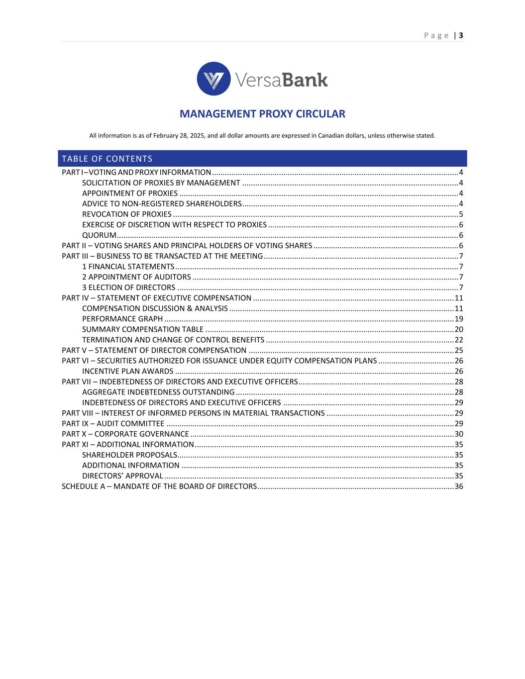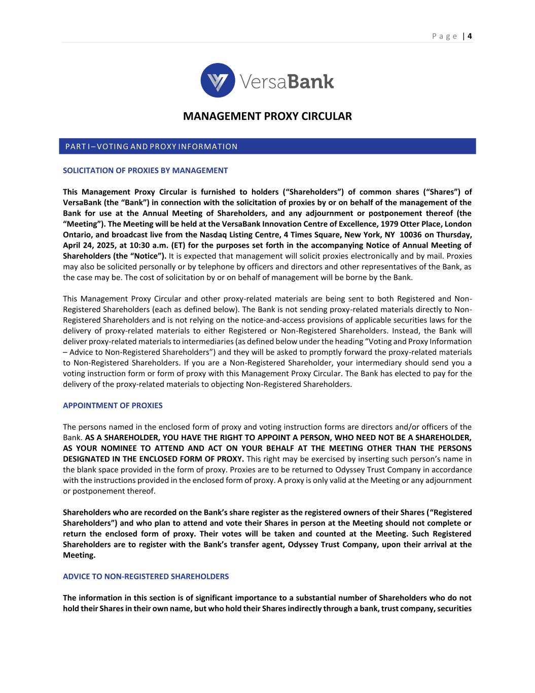 P a g e | 4 MANAGEMENT PROXY CIRCULAR PART I – VOTING AND PROXY INFORMATION SOLICITATION OF PROXIES BY MANAGEMENT This Management Proxy Circular is furnished to holders (“Shareholders”) of common shares (“Shares”) of VersaBank (the “Bank”) in connection with the solicitation of proxies by or on behalf of the management of the Bank for use at the Annual Meeting of Shareholders, and any adjournment or postponement thereof (the “Meeting”). The Meeting will be held at the VersaBank Innovation Centre of Excellence, 1979 Otter Place, London Ontario, and broadcast live from the Nasdaq Listing Centre, 4 Times Square, New York, NY 10036 on Thursday, April 24, 2025, at 10:30 a.m. (ET) for the purposes set forth in the accompanying Notice of Annual Meeting of Shareholders (the “Notice”). It is expected that management will solicit proxies electronically and by mail. Proxies may also be solicited personally or by telephone by officers and directors and other representatives of the Bank, as the case may be. The cost of solicitation by or on behalf of management will be borne by the Bank. This Management Proxy Circular and other proxy-related materials are being sent to both Registered and Non- Registered Shareholders (each as defined below). The Bank is not sending proxy-related materials directly to Non- Registered Shareholders and is not relying on the notice-and-access provisions of applicable securities laws for the delivery of proxy-related materials to either Registered or Non-Registered Shareholders. Instead, the Bank will deliver proxy-related materials to intermediaries (as defined below under the heading “Voting and Proxy Information – Advice to Non-Registered Shareholders”) and they will be asked to promptly forward the proxy-related materials to Non-Registered Shareholders. If you are a Non-Registered Shareholder, your intermediary should send you a voting instruction form or form of proxy with this Management Proxy Circular. The Bank has elected to pay for the delivery of the proxy-related materials to objecting Non-Registered Shareholders. APPOINTMENT OF PROXIES The persons named in the enclosed form of proxy and voting instruction forms are directors and/or officers of the Bank. AS A SHAREHOLDER, YOU HAVE THE RIGHT TO APPOINT A PERSON, WHO NEED NOT BE A SHAREHOLDER, AS YOUR NOMINEE TO ATTEND AND ACT ON YOUR BEHALF AT THE MEETING OTHER THAN THE PERSONS DESIGNATED IN THE ENCLOSED FORM OF PROXY. This right may be exercised by inserting such person’s name in the blank space provided in the form of proxy. Proxies are to be returned to Odyssey Trust Company in accordance with the instructions provided in the enclosed form of proxy. A proxy is only valid at the Meeting or any adjournment or postponement thereof. Shareholders who are recorded on the Bank’s share register as the registered owners of their Shares (“Registered Shareholders”) and who plan to attend and vote their Shares in person at the Meeting should not complete or return the enclosed form of proxy. Their votes will be taken and counted at the Meeting. Such Registered Shareholders are to register with the Bank’s transfer agent, Odyssey Trust Company, upon their arrival at the Meeting. ADVICE TO NON-REGISTERED SHAREHOLDERS The information in this section is of significant importance to a substantial number of Shareholders who do not hold their Shares in their own name, but who hold their Shares indirectly through a bank, trust company, securities