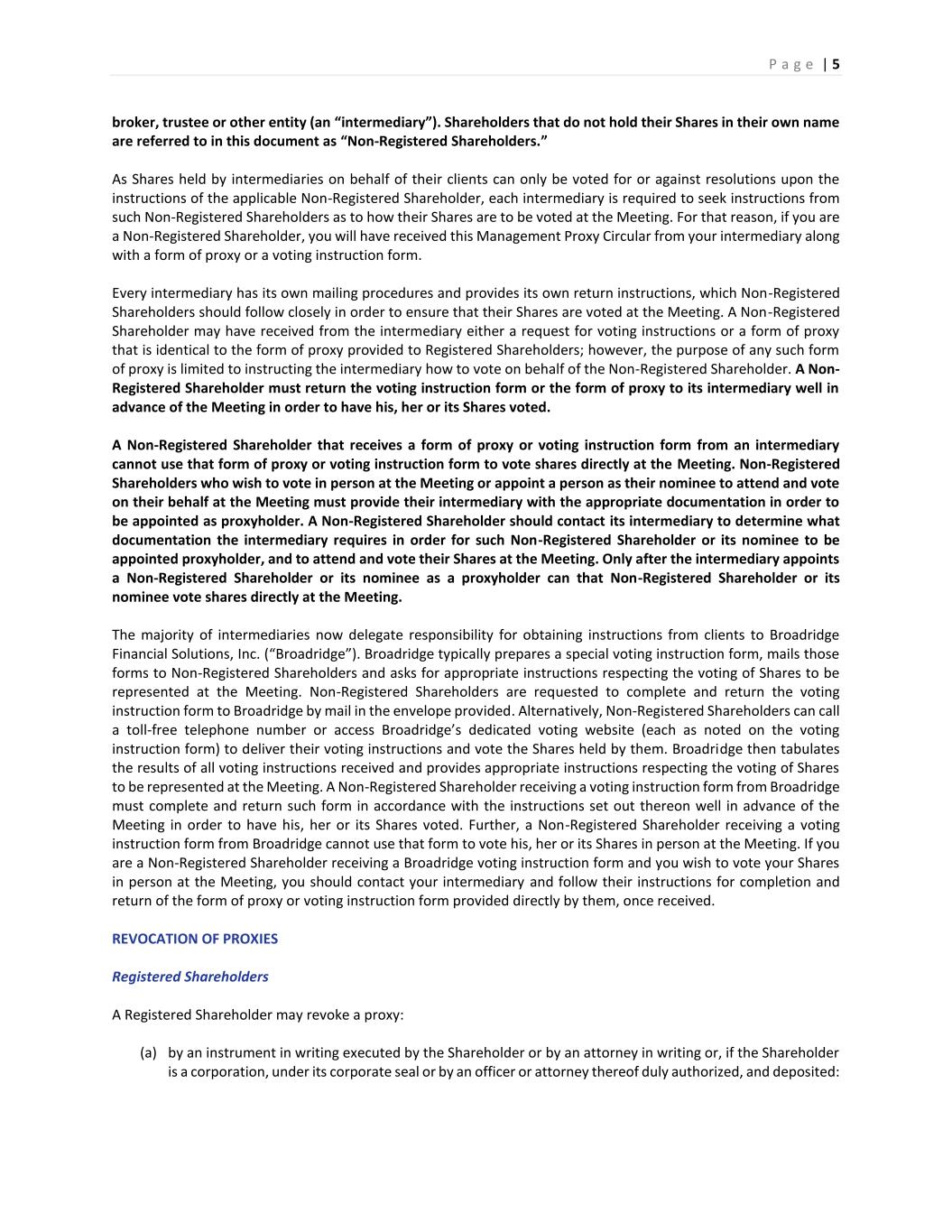 P a g e | 5 broker, trustee or other entity (an “intermediary”). Shareholders that do not hold their Shares in their own name are referred to in this document as “Non-Registered Shareholders.” As Shares held by intermediaries on behalf of their clients can only be voted for or against resolutions upon the instructions of the applicable Non-Registered Shareholder, each intermediary is required to seek instructions from such Non-Registered Shareholders as to how their Shares are to be voted at the Meeting. For that reason, if you are a Non-Registered Shareholder, you will have received this Management Proxy Circular from your intermediary along with a form of proxy or a voting instruction form. Every intermediary has its own mailing procedures and provides its own return instructions, which Non-Registered Shareholders should follow closely in order to ensure that their Shares are voted at the Meeting. A Non-Registered Shareholder may have received from the intermediary either a request for voting instructions or a form of proxy that is identical to the form of proxy provided to Registered Shareholders; however, the purpose of any such form of proxy is limited to instructing the intermediary how to vote on behalf of the Non-Registered Shareholder. A Non- Registered Shareholder must return the voting instruction form or the form of proxy to its intermediary well in advance of the Meeting in order to have his, her or its Shares voted. A Non-Registered Shareholder that receives a form of proxy or voting instruction form from an intermediary cannot use that form of proxy or voting instruction form to vote shares directly at the Meeting. Non-Registered Shareholders who wish to vote in person at the Meeting or appoint a person as their nominee to attend and vote on their behalf at the Meeting must provide their intermediary with the appropriate documentation in order to be appointed as proxyholder. A Non-Registered Shareholder should contact its intermediary to determine what documentation the intermediary requires in order for such Non-Registered Shareholder or its nominee to be appointed proxyholder, and to attend and vote their Shares at the Meeting. Only after the intermediary appoints a Non-Registered Shareholder or its nominee as a proxyholder can that Non-Registered Shareholder or its nominee vote shares directly at the Meeting. The majority of intermediaries now delegate responsibility for obtaining instructions from clients to Broadridge Financial Solutions, Inc. (“Broadridge”). Broadridge typically prepares a special voting instruction form, mails those forms to Non-Registered Shareholders and asks for appropriate instructions respecting the voting of Shares to be represented at the Meeting. Non-Registered Shareholders are requested to complete and return the voting instruction form to Broadridge by mail in the envelope provided. Alternatively, Non-Registered Shareholders can call a toll-free telephone number or access Broadridge’s dedicated voting website (each as noted on the voting instruction form) to deliver their voting instructions and vote the Shares held by them. Broadridge then tabulates the results of all voting instructions received and provides appropriate instructions respecting the voting of Shares to be represented at the Meeting. A Non-Registered Shareholder receiving a voting instruction form from Broadridge must complete and return such form in accordance with the instructions set out thereon well in advance of the Meeting in order to have his, her or its Shares voted. Further, a Non-Registered Shareholder receiving a voting instruction form from Broadridge cannot use that form to vote his, her or its Shares in person at the Meeting. If you are a Non-Registered Shareholder receiving a Broadridge voting instruction form and you wish to vote your Shares in person at the Meeting, you should contact your intermediary and follow their instructions for completion and return of the form of proxy or voting instruction form provided directly by them, once received. REVOCATION OF PROXIES Registered Shareholders A Registered Shareholder may revoke a proxy: (a) by an instrument in writing executed by the Shareholder or by an attorney in writing or, if the Shareholder is a corporation, under its corporate seal or by an officer or attorney thereof duly authorized, and deposited: