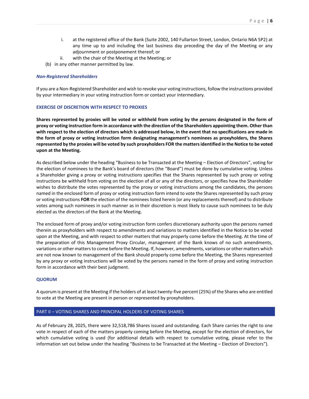 P a g e | 6 i. at the registered office of the Bank (Suite 2002, 140 Fullarton Street, London, Ontario N6A 5P2) at any time up to and including the last business day preceding the day of the Meeting or any adjournment or postponement thereof; or ii. with the chair of the Meeting at the Meeting; or (b) in any other manner permitted by law. Non-Registered Shareholders If you are a Non-Registered Shareholder and wish to revoke your voting instructions, follow the instructions provided by your intermediary in your voting instruction form or contact your intermediary. EXERCISE OF DISCRETION WITH RESPECT TO PROXIES Shares represented by proxies will be voted or withheld from voting by the persons designated in the form of proxy or voting instruction form in accordance with the direction of the Shareholders appointing them. Other than with respect to the election of directors which is addressed below, in the event that no specifications are made in the form of proxy or voting instruction form designating management’s nominees as proxyholders, the Shares represented by the proxies will be voted by such proxyholders FOR the matters identified in the Notice to be voted upon at the Meeting. As described below under the heading “Business to be Transacted at the Meeting – Election of Directors”, voting for the election of nominees to the Bank’s board of directors (the “Board”) must be done by cumulative voting. Unless a Shareholder giving a proxy or voting instructions specifies that the Shares represented by such proxy or voting instructions be withheld from voting on the election of all or any of the directors, or specifies how the Shareholder wishes to distribute the votes represented by the proxy or voting instructions among the candidates, the persons named in the enclosed form of proxy or voting instruction form intend to vote the Shares represented by such proxy or voting instructions FOR the election of the nominees listed herein (or any replacements thereof) and to distribute votes among such nominees in such manner as in their discretion is most likely to cause such nominees to be duly elected as the directors of the Bank at the Meeting. The enclosed form of proxy and/or voting instruction form confers discretionary authority upon the persons named therein as proxyholders with respect to amendments and variations to matters identified in the Notice to be voted upon at the Meeting, and with respect to other matters that may properly come before the Meeting. At the time of the preparation of this Management Proxy Circular, management of the Bank knows of no such amendments, variations or other matters to come before the Meeting. If, however, amendments, variations or other matters which are not now known to management of the Bank should properly come before the Meeting, the Shares represented by any proxy or voting instructions will be voted by the persons named in the form of proxy and voting instruction form in accordance with their best judgment. QUORUM A quorum is present at the Meeting if the holders of at least twenty-five percent (25%) of the Shares who are entitled to vote at the Meeting are present in person or represented by proxyholders. PART II – VOTING SHARES AND PRINCIPAL HOLDERS OF VOTING SHARES As of February 28, 2025, there were 32,518,786 Shares issued and outstanding. Each Share carries the right to one vote in respect of each of the matters properly coming before the Meeting, except for the election of directors, for which cumulative voting is used (for additional details with respect to cumulative voting, please refer to the information set out below under the heading “Business to be Transacted at the Meeting – Election of Directors”).