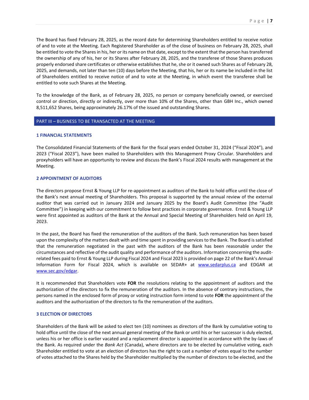 P a g e | 7 The Board has fixed February 28, 2025, as the record date for determining Shareholders entitled to receive notice of and to vote at the Meeting. Each Registered Shareholder as of the close of business on February 28, 2025, shall be entitled to vote the Shares in his, her or its name on that date, except to the extent that the person has transferred the ownership of any of his, her or its Shares after February 28, 2025, and the transferee of those Shares produces properly endorsed share certificates or otherwise establishes that he, she or it owned such Shares as of February 28, 2025, and demands, not later than ten (10) days before the Meeting, that his, her or its name be included in the list of Shareholders entitled to receive notice of and to vote at the Meeting, in which event the transferee shall be entitled to vote such Shares at the Meeting. To the knowledge of the Bank, as of February 28, 2025, no person or company beneficially owned, or exercised control or direction, directly or indirectly, over more than 10% of the Shares, other than GBH Inc., which owned 8,511,652 Shares, being approximately 26.17% of the issued and outstanding Shares. PART III – BUSINESS TO BE TRANSACTED AT THE MEETING 1 FINANCIAL STATEMENTS The Consolidated Financial Statements of the Bank for the fiscal years ended October 31, 2024 (“Fiscal 2024”), and 2023 (“Fiscal 2023”), have been mailed to Shareholders with this Management Proxy Circular. Shareholders and proxyholders will have an opportunity to review and discuss the Bank’s Fiscal 2024 results with management at the Meeting. 2 APPOINTMENT OF AUDITORS The directors propose Ernst & Young LLP for re-appointment as auditors of the Bank to hold office until the close of the Bank’s next annual meeting of Shareholders. This proposal is supported by the annual review of the external auditor that was carried out in January 2024 and January 2025 by the Board’s Audit Committee (the “Audit Committee”) in keeping with our commitment to follow best practices in corporate governance. Ernst & Young LLP were first appointed as auditors of the Bank at the Annual and Special Meeting of Shareholders held on April 19, 2023. In the past, the Board has fixed the remuneration of the auditors of the Bank. Such remuneration has been based upon the complexity of the matters dealt with and time spent in providing services to the Bank. The Board is satisfied that the remuneration negotiated in the past with the auditors of the Bank has been reasonable under the circumstances and reflective of the audit quality and performance of the auditors. Information concerning the audit- related fees paid to Ernst & Young LLP during Fiscal 2024 and Fiscal 2023 is provided on page 22 of the Bank’s Annual Information Form for Fiscal 2024, which is available on SEDAR+ at www.sedarplus.ca and EDGAR at www.sec.gov/edgar. It is recommended that Shareholders vote FOR the resolutions relating to the appointment of auditors and the authorization of the directors to fix the remuneration of the auditors. In the absence of contrary instructions, the persons named in the enclosed form of proxy or voting instruction form intend to vote FOR the appointment of the auditors and the authorization of the directors to fix the remuneration of the auditors. 3 ELECTION OF DIRECTORS Shareholders of the Bank will be asked to elect ten (10) nominees as directors of the Bank by cumulative voting to hold office until the close of the next annual general meeting of the Bank or until his or her successor is duly elected, unless his or her office is earlier vacated and a replacement director is appointed in accordance with the by-laws of the Bank. As required under the Bank Act (Canada), where directors are to be elected by cumulative voting, each Shareholder entitled to vote at an election of directors has the right to cast a number of votes equal to the number of votes attached to the Shares held by the Shareholder multiplied by the number of directors to be elected, and the