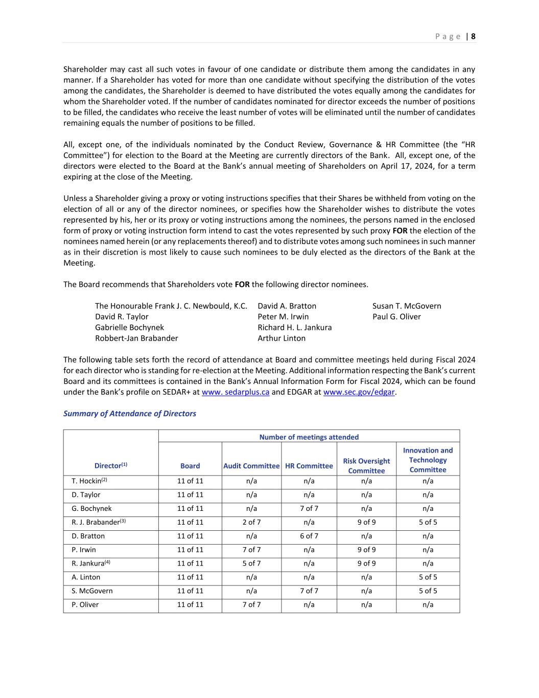 P a g e | 8 Shareholder may cast all such votes in favour of one candidate or distribute them among the candidates in any manner. If a Shareholder has voted for more than one candidate without specifying the distribution of the votes among the candidates, the Shareholder is deemed to have distributed the votes equally among the candidates for whom the Shareholder voted. If the number of candidates nominated for director exceeds the number of positions to be filled, the candidates who receive the least number of votes will be eliminated until the number of candidates remaining equals the number of positions to be filled. All, except one, of the individuals nominated by the Conduct Review, Governance & HR Committee (the “HR Committee”) for election to the Board at the Meeting are currently directors of the Bank. All, except one, of the directors were elected to the Board at the Bank’s annual meeting of Shareholders on April 17, 2024, for a term expiring at the close of the Meeting. Unless a Shareholder giving a proxy or voting instructions specifies that their Shares be withheld from voting on the election of all or any of the director nominees, or specifies how the Shareholder wishes to distribute the votes represented by his, her or its proxy or voting instructions among the nominees, the persons named in the enclosed form of proxy or voting instruction form intend to cast the votes represented by such proxy FOR the election of the nominees named herein (or any replacements thereof) and to distribute votes among such nominees in such manner as in their discretion is most likely to cause such nominees to be duly elected as the directors of the Bank at the Meeting. The Board recommends that Shareholders vote FOR the following director nominees. The Honourable Frank J. C. Newbould, K.C. David A. Bratton Susan T. McGovern David R. Taylor Peter M. Irwin Paul G. Oliver Gabrielle Bochynek Richard H. L. Jankura Robbert-Jan Brabander Arthur Linton The following table sets forth the record of attendance at Board and committee meetings held during Fiscal 2024 for each director who is standing for re-election at the Meeting. Additional information respecting the Bank’s current Board and its committees is contained in the Bank’s Annual Information Form for Fiscal 2024, which can be found under the Bank’s profile on SEDAR+ at www. sedarplus.ca and EDGAR at www.sec.gov/edgar. Summary of Attendance of Directors Director(1) Number of meetings attended Board Audit Committee HR Committee Risk Oversight Committee Innovation and Technology Committee T. Hockin(2) 11 of 11 n/a n/a n/a n/a D. Taylor 11 of 11 n/a n/a n/a n/a G. Bochynek 11 of 11 n/a 7 of 7 n/a n/a R. J. Brabander(3) 11 of 11 2 of 7 n/a 9 of 9 5 of 5 D. Bratton 11 of 11 n/a 6 of 7 n/a n/a P. Irwin 11 of 11 7 of 7 n/a 9 of 9 n/a R. Jankura(4) 11 of 11 5 of 7 n/a 9 of 9 n/a A. Linton 11 of 11 n/a n/a n/a 5 of 5 S. McGovern 11 of 11 n/a 7 of 7 n/a 5 of 5 P. Oliver 11 of 11 7 of 7 n/a n/a n/a