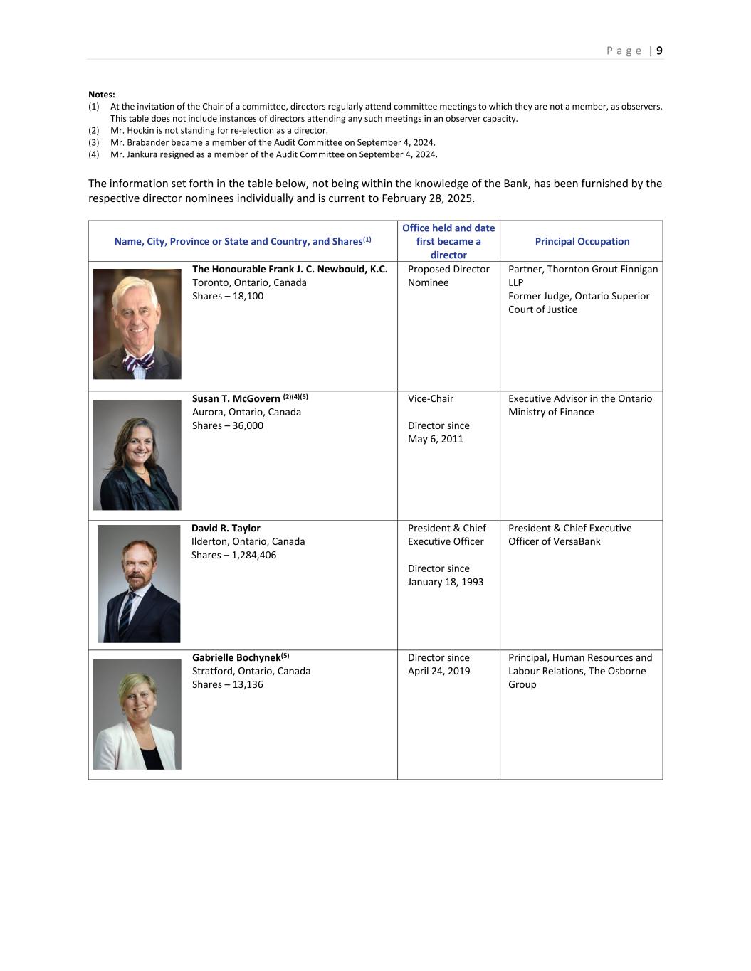 P a g e | 9 Notes: (1) At the invitation of the Chair of a committee, directors regularly attend committee meetings to which they are not a member, as observers. This table does not include instances of directors attending any such meetings in an observer capacity. (2) Mr. Hockin is not standing for re-election as a director. (3) Mr. Brabander became a member of the Audit Committee on September 4, 2024. (4) Mr. Jankura resigned as a member of the Audit Committee on September 4, 2024. The information set forth in the table below, not being within the knowledge of the Bank, has been furnished by the respective director nominees individually and is current to February 28, 2025. Name, City, Province or State and Country, and Shares(1) Office held and date first became a director Principal Occupation The Honourable Frank J. C. Newbould, K.C. Toronto, Ontario, Canada Shares – 18,100 Proposed Director Nominee Partner, Thornton Grout Finnigan LLP Former Judge, Ontario Superior Court of Justice Susan T. McGovern (2)(4)(5) Aurora, Ontario, Canada Shares – 36,000 Vice-Chair Director since May 6, 2011 Executive Advisor in the Ontario Ministry of Finance David R. Taylor Ilderton, Ontario, Canada Shares – 1,284,406 President & Chief Executive Officer Director since January 18, 1993 President & Chief Executive Officer of VersaBank Gabrielle Bochynek(5) Stratford, Ontario, Canada Shares – 13,136 Director since April 24, 2019 Principal, Human Resources and Labour Relations, The Osborne Group