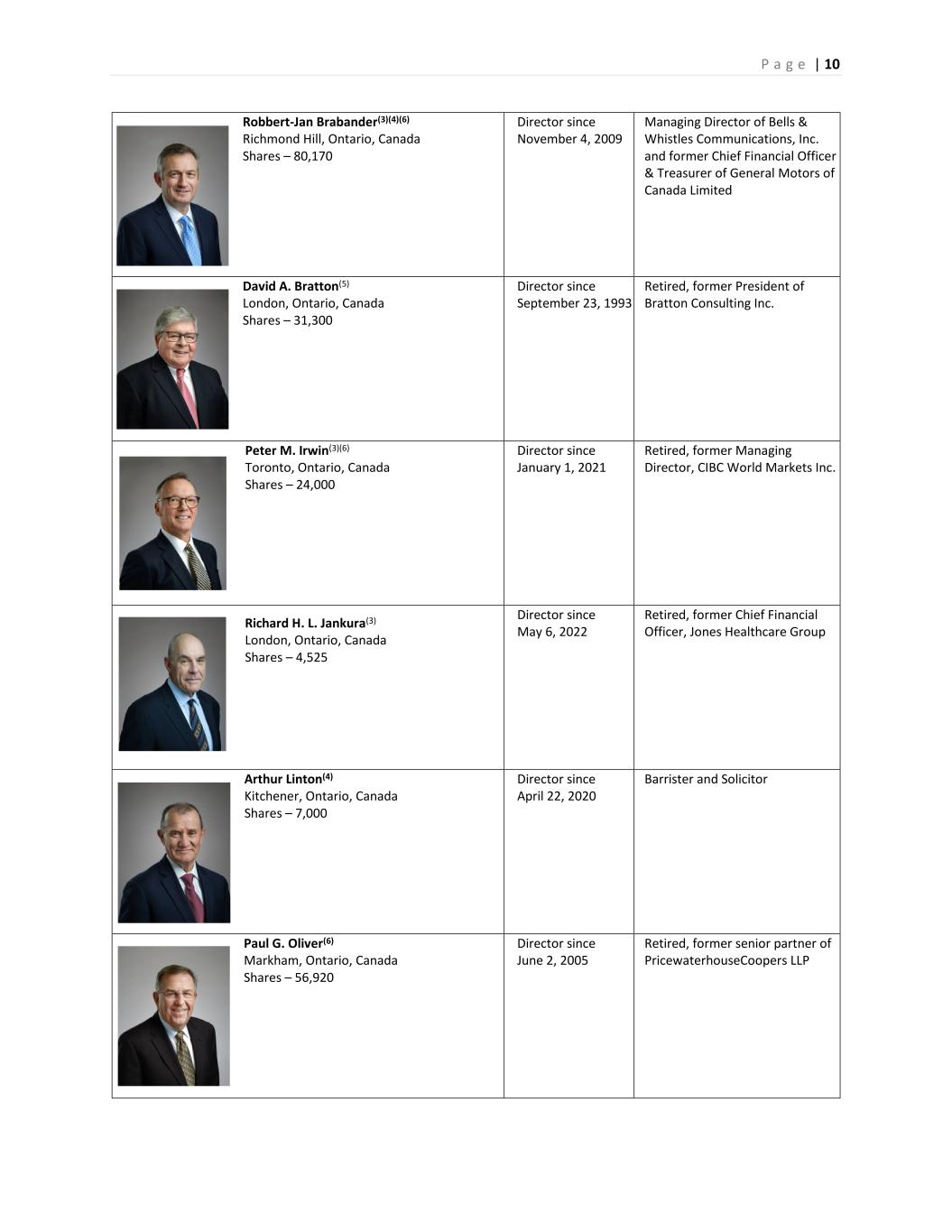 P a g e | 10 Robbert-Jan Brabander(3)(4)(6) Richmond Hill, Ontario, Canada Shares – 80,170 Director since November 4, 2009 Managing Director of Bells & Whistles Communications, Inc. and former Chief Financial Officer & Treasurer of General Motors of Canada Limited David A. Bratton(5) London, Ontario, Canada Shares – 31,300 Director since September 23, 1993 Retired, former President of Bratton Consulting Inc. Peter M. Irwin(3)(6) Toronto, Ontario, Canada Shares – 24,000 Director since January 1, 2021 Retired, former Managing Director, CIBC World Markets Inc. Director since May 6, 2022 Retired, former Chief Financial Officer, Jones Healthcare Group Arthur Linton(4) Kitchener, Ontario, Canada Shares – 7,000 Director since April 22, 2020 Barrister and Solicitor Paul G. Oliver(6) Markham, Ontario, Canada Shares – 56,920 Director since June 2, 2005 Retired, former senior partner of PricewaterhouseCoopers LLP Richard H. L. Jankura(3) London, Ontario, Canada Shares – 4,525