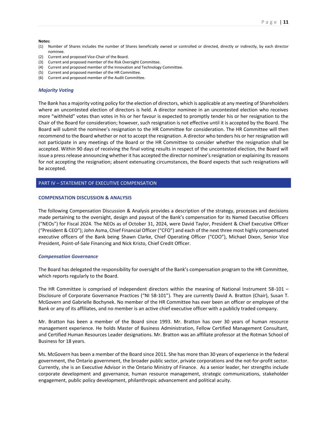 P a g e | 11 Notes: (1) Number of Shares includes the number of Shares beneficially owned or controlled or directed, directly or indirectly, by each director nominee. (2) Current and proposed Vice-Chair of the Board. (3) Current and proposed member of the Risk Oversight Committee. (4) Current and proposed member of the Innovation and Technology Committee. (5) Current and proposed member of the HR Committee. (6) Current and proposed member of the Audit Committee. Majority Voting The Bank has a majority voting policy for the election of directors, which is applicable at any meeting of Shareholders where an uncontested election of directors is held. A director nominee in an uncontested election who receives more “withheld” votes than votes in his or her favour is expected to promptly tender his or her resignation to the Chair of the Board for consideration; however, such resignation is not effective until it is accepted by the Board. The Board will submit the nominee’s resignation to the HR Committee for consideration. The HR Committee will then recommend to the Board whether or not to accept the resignation. A director who tenders his or her resignation will not participate in any meetings of the Board or the HR Committee to consider whether the resignation shall be accepted. Within 90 days of receiving the final voting results in respect of the uncontested election, the Board will issue a press release announcing whether it has accepted the director nominee’s resignation or explaining its reasons for not accepting the resignation; absent extenuating circumstances, the Board expects that such resignations will be accepted. PART IV – STATEMENT OF EXECUTIVE COMPENSATION COMPENSATION DISCUSSION & ANALYSIS The following Compensation Discussion & Analysis provides a description of the strategy, processes and decisions made pertaining to the oversight, design and payout of the Bank’s compensation for its Named Executive Officers (“NEOs”) for Fiscal 2024. The NEOs as of October 31, 2024, were David Taylor, President & Chief Executive Officer (“President & CEO”); John Asma, Chief Financial Officer (“CFO”) and each of the next three most highly compensated executive officers of the Bank being Shawn Clarke, Chief Operating Officer (“COO”), Michael Dixon, Senior Vice President, Point-of-Sale Financing and Nick Kristo, Chief Credit Officer. Compensation Governance The Board has delegated the responsibility for oversight of the Bank’s compensation program to the HR Committee, which reports regularly to the Board. The HR Committee is comprised of independent directors within the meaning of National Instrument 58-101 – Disclosure of Corporate Governance Practices (“NI 58-101”). They are currently David A. Bratton (Chair), Susan T. McGovern and Gabrielle Bochynek. No member of the HR Committee has ever been an officer or employee of the Bank or any of its affiliates, and no member is an active chief executive officer with a publicly traded company. Mr. Bratton has been a member of the Board since 1993. Mr. Bratton has over 30 years of human resource management experience. He holds Master of Business Administration, Fellow Certified Management Consultant, and Certified Human Resources Leader designations. Mr. Bratton was an affiliate professor at the Rotman School of Business for 18 years. Ms. McGovern has been a member of the Board since 2011. She has more than 30 years of experience in the federal government, the Ontario government, the broader public sector, private corporations and the not-for-profit sector. Currently, she is an Executive Advisor in the Ontario Ministry of Finance. As a senior leader, her strengths include corporate development and governance, human resource management, strategic communications, stakeholder engagement, public policy development, philanthropic advancement and political acuity.
