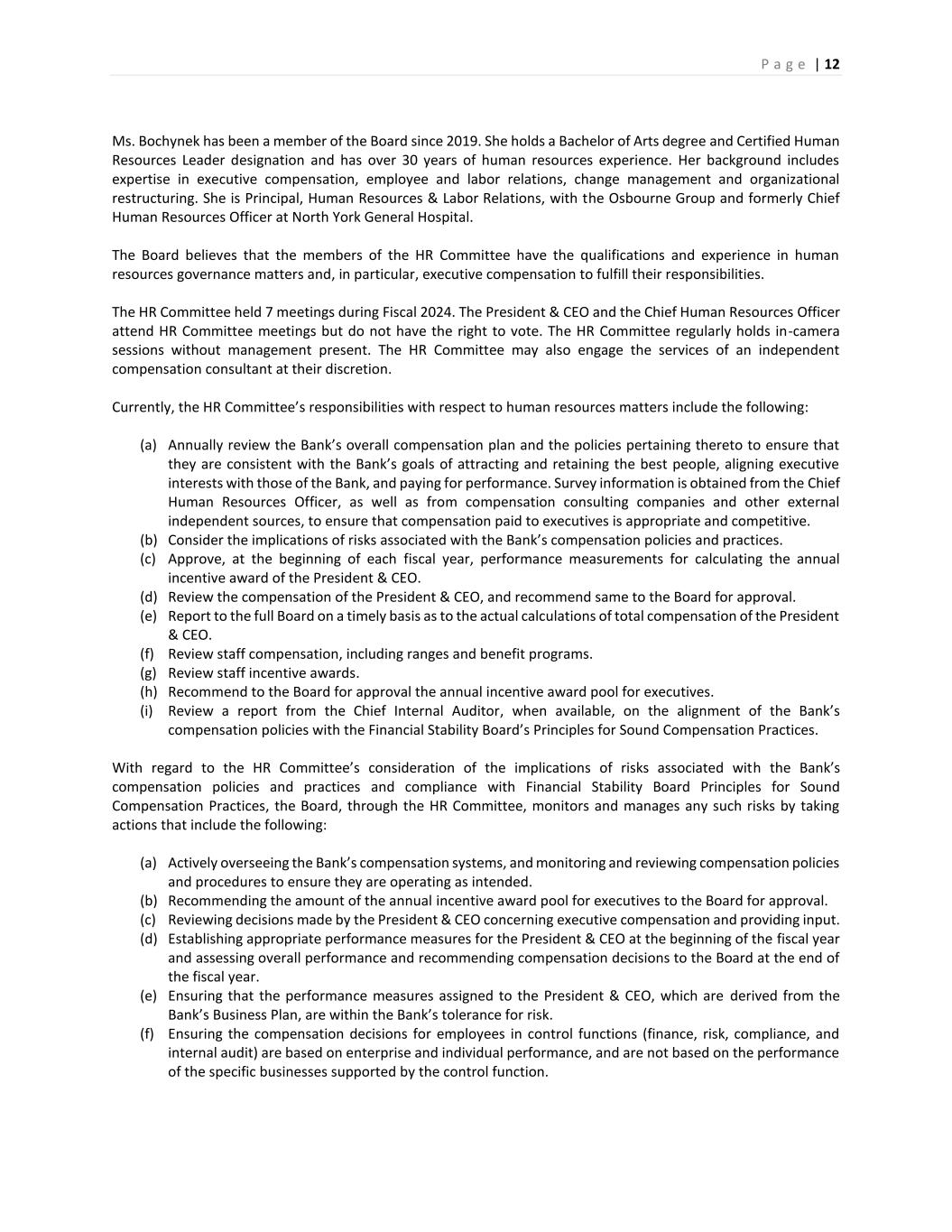 P a g e | 12 Ms. Bochynek has been a member of the Board since 2019. She holds a Bachelor of Arts degree and Certified Human Resources Leader designation and has over 30 years of human resources experience. Her background includes expertise in executive compensation, employee and labor relations, change management and organizational restructuring. She is Principal, Human Resources & Labor Relations, with the Osbourne Group and formerly Chief Human Resources Officer at North York General Hospital. The Board believes that the members of the HR Committee have the qualifications and experience in human resources governance matters and, in particular, executive compensation to fulfill their responsibilities. The HR Committee held 7 meetings during Fiscal 2024. The President & CEO and the Chief Human Resources Officer attend HR Committee meetings but do not have the right to vote. The HR Committee regularly holds in-camera sessions without management present. The HR Committee may also engage the services of an independent compensation consultant at their discretion. Currently, the HR Committee’s responsibilities with respect to human resources matters include the following: (a) Annually review the Bank’s overall compensation plan and the policies pertaining thereto to ensure that they are consistent with the Bank’s goals of attracting and retaining the best people, aligning executive interests with those of the Bank, and paying for performance. Survey information is obtained from the Chief Human Resources Officer, as well as from compensation consulting companies and other external independent sources, to ensure that compensation paid to executives is appropriate and competitive. (b) Consider the implications of risks associated with the Bank’s compensation policies and practices. (c) Approve, at the beginning of each fiscal year, performance measurements for calculating the annual incentive award of the President & CEO. (d) Review the compensation of the President & CEO, and recommend same to the Board for approval. (e) Report to the full Board on a timely basis as to the actual calculations of total compensation of the President & CEO. (f) Review staff compensation, including ranges and benefit programs. (g) Review staff incentive awards. (h) Recommend to the Board for approval the annual incentive award pool for executives. (i) Review a report from the Chief Internal Auditor, when available, on the alignment of the Bank’s compensation policies with the Financial Stability Board’s Principles for Sound Compensation Practices. With regard to the HR Committee’s consideration of the implications of risks associated with the Bank’s compensation policies and practices and compliance with Financial Stability Board Principles for Sound Compensation Practices, the Board, through the HR Committee, monitors and manages any such risks by taking actions that include the following: (a) Actively overseeing the Bank’s compensation systems, and monitoring and reviewing compensation policies and procedures to ensure they are operating as intended. (b) Recommending the amount of the annual incentive award pool for executives to the Board for approval. (c) Reviewing decisions made by the President & CEO concerning executive compensation and providing input. (d) Establishing appropriate performance measures for the President & CEO at the beginning of the fiscal year and assessing overall performance and recommending compensation decisions to the Board at the end of the fiscal year. (e) Ensuring that the performance measures assigned to the President & CEO, which are derived from the Bank’s Business Plan, are within the Bank’s tolerance for risk. (f) Ensuring the compensation decisions for employees in control functions (finance, risk, compliance, and internal audit) are based on enterprise and individual performance, and are not based on the performance of the specific businesses supported by the control function.