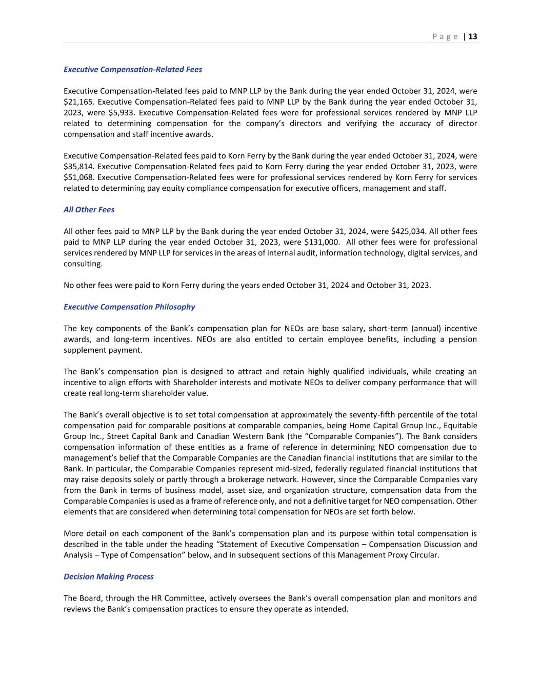 P a g e | 13 Executive Compensation-Related Fees Executive Compensation-Related fees paid to MNP LLP by the Bank during the year ended October 31, 2024, were $21,165. Executive Compensation-Related fees paid to MNP LLP by the Bank during the year ended October 31, 2023, were $5,933. Executive Compensation-Related fees were for professional services rendered by MNP LLP related to determining compensation for the company’s directors and verifying the accuracy of director compensation and staff incentive awards. Executive Compensation-Related fees paid to Korn Ferry by the Bank during the year ended October 31, 2024, were $35,814. Executive Compensation-Related fees paid to Korn Ferry during the year ended October 31, 2023, were $51,068. Executive Compensation-Related fees were for professional services rendered by Korn Ferry for services related to determining pay equity compliance compensation for executive officers, management and staff. All Other Fees All other fees paid to MNP LLP by the Bank during the year ended October 31, 2024, were $425,034. All other fees paid to MNP LLP during the year ended October 31, 2023, were $131,000. All other fees were for professional services rendered by MNP LLP for services in the areas of internal audit, information technology, digital services, and consulting. No other fees were paid to Korn Ferry during the years ended October 31, 2024 and October 31, 2023. Executive Compensation Philosophy The key components of the Bank’s compensation plan for NEOs are base salary, short-term (annual) incentive awards, and long-term incentives. NEOs are also entitled to certain employee benefits, including a pension supplement payment. The Bank’s compensation plan is designed to attract and retain highly qualified individuals, while creating an incentive to align efforts with Shareholder interests and motivate NEOs to deliver company performance that will create real long-term shareholder value. The Bank’s overall objective is to set total compensation at approximately the seventy-fifth percentile of the total compensation paid for comparable positions at comparable companies, being Home Capital Group Inc., Equitable Group Inc., Street Capital Bank and Canadian Western Bank (the “Comparable Companies”). The Bank considers compensation information of these entities as a frame of reference in determining NEO compensation due to management’s belief that the Comparable Companies are the Canadian financial institutions that are similar to the Bank. In particular, the Comparable Companies represent mid-sized, federally regulated financial institutions that may raise deposits solely or partly through a brokerage network. However, since the Comparable Companies vary from the Bank in terms of business model, asset size, and organization structure, compensation data from the Comparable Companies is used as a frame of reference only, and not a definitive target for NEO compensation. Other elements that are considered when determining total compensation for NEOs are set forth below. More detail on each component of the Bank’s compensation plan and its purpose within total compensation is described in the table under the heading “Statement of Executive Compensation – Compensation Discussion and Analysis – Type of Compensation” below, and in subsequent sections of this Management Proxy Circular. Decision Making Process The Board, through the HR Committee, actively oversees the Bank’s overall compensation plan and monitors and reviews the Bank’s compensation practices to ensure they operate as intended.