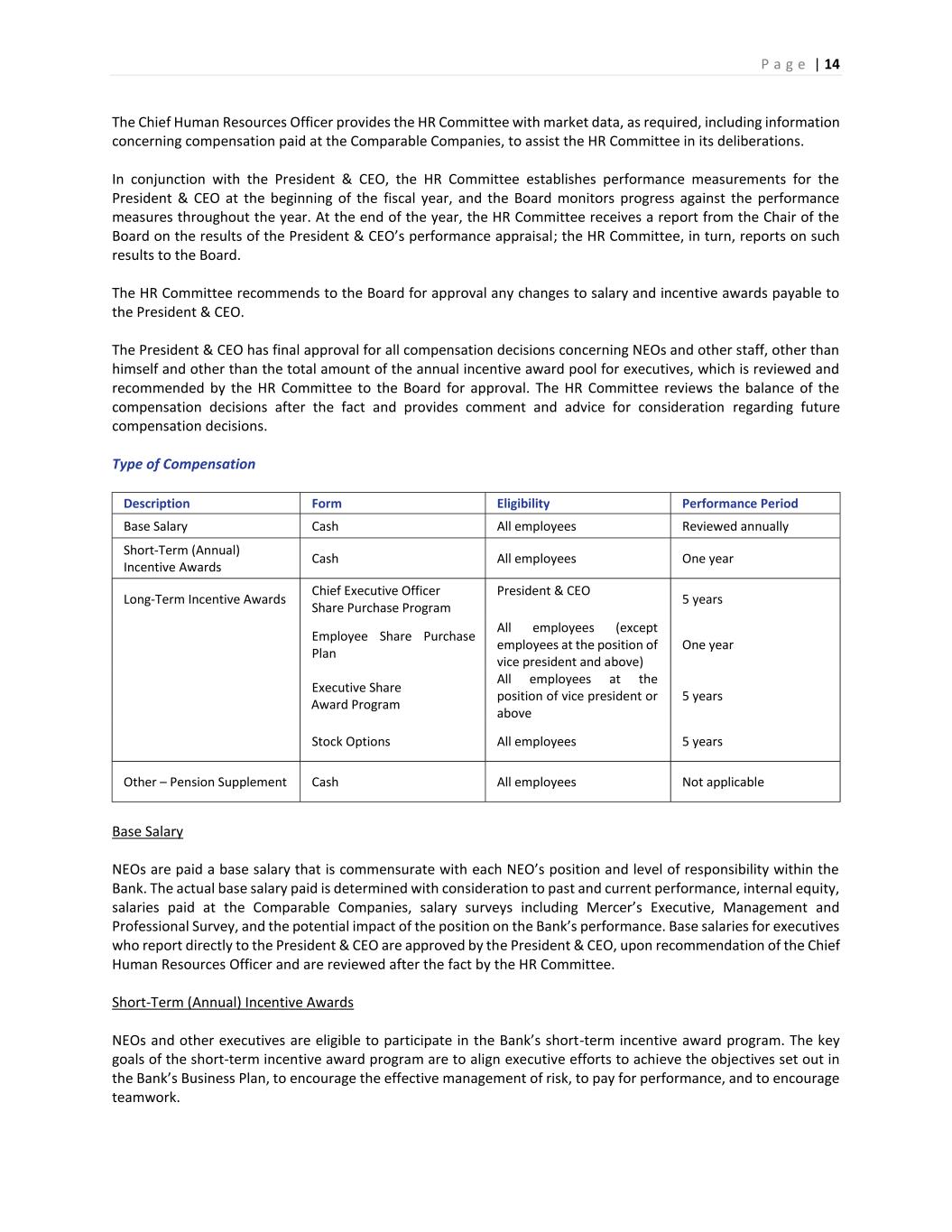 P a g e | 14 The Chief Human Resources Officer provides the HR Committee with market data, as required, including information concerning compensation paid at the Comparable Companies, to assist the HR Committee in its deliberations. In conjunction with the President & CEO, the HR Committee establishes performance measurements for the President & CEO at the beginning of the fiscal year, and the Board monitors progress against the performance measures throughout the year. At the end of the year, the HR Committee receives a report from the Chair of the Board on the results of the President & CEO’s performance appraisal; the HR Committee, in turn, reports on such results to the Board. The HR Committee recommends to the Board for approval any changes to salary and incentive awards payable to the President & CEO. The President & CEO has final approval for all compensation decisions concerning NEOs and other staff, other than himself and other than the total amount of the annual incentive award pool for executives, which is reviewed and recommended by the HR Committee to the Board for approval. The HR Committee reviews the balance of the compensation decisions after the fact and provides comment and advice for consideration regarding future compensation decisions. Type of Compensation Description Form Eligibility Performance Period Base Salary Cash All employees Reviewed annually Short-Term (Annual) Incentive Awards Cash All employees One year Long-Term Incentive Awards Chief Executive Officer Share Purchase Program President & CEO 5 years Employee Share Purchase Plan All employees (except employees at the position of vice president and above) One year Executive Share Award Program All employees at the position of vice president or above 5 years Stock Options All employees 5 years Other – Pension Supplement Cash All employees Not applicable Base Salary NEOs are paid a base salary that is commensurate with each NEO’s position and level of responsibility within the Bank. The actual base salary paid is determined with consideration to past and current performance, internal equity, salaries paid at the Comparable Companies, salary surveys including Mercer’s Executive, Management and Professional Survey, and the potential impact of the position on the Bank’s performance. Base salaries for executives who report directly to the President & CEO are approved by the President & CEO, upon recommendation of the Chief Human Resources Officer and are reviewed after the fact by the HR Committee. Short-Term (Annual) Incentive Awards NEOs and other executives are eligible to participate in the Bank’s short-term incentive award program. The key goals of the short-term incentive award program are to align executive efforts to achieve the objectives set out in the Bank’s Business Plan, to encourage the effective management of risk, to pay for performance, and to encourage teamwork.