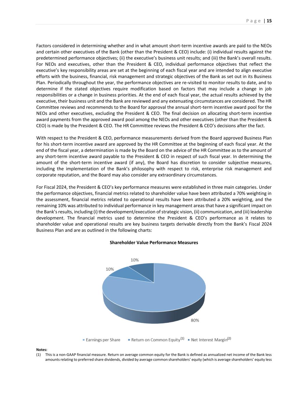 P a g e | 15 Factors considered in determining whether and in what amount short-term incentive awards are paid to the NEOs and certain other executives of the Bank (other than the President & CEO) include: (i) individual results against the predetermined performance objectives; (ii) the executive’s business unit results; and (iii) the Bank’s overall results. For NEOs and executives, other than the President & CEO, individual performance objectives that reflect the executive’s key responsibility areas are set at the beginning of each fiscal year and are intended to align executive efforts with the business, financial, risk management and strategic objectives of the Bank as set out in its Business Plan. Periodically throughout the year, the performance objectives are re-visited to monitor results to date, and to determine if the stated objectives require modification based on factors that may include a change in job responsibilities or a change in business priorities. At the end of each fiscal year, the actual results achieved by the executive, their business unit and the Bank are reviewed and any extenuating circumstances are considered. The HR Committee reviews and recommends to the Board for approval the annual short-term incentive award pool for the NEOs and other executives, excluding the President & CEO. The final decision on allocating short-term incentive award payments from the approved award pool among the NEOs and other executives (other than the President & CEO) is made by the President & CEO. The HR Committee reviews the President & CEO’s decisions after the fact. With respect to the President & CEO, performance measurements derived from the Board approved Business Plan for his short-term incentive award are approved by the HR Committee at the beginning of each fiscal year. At the end of the fiscal year, a determination is made by the Board on the advice of the HR Committee as to the amount of any short-term incentive award payable to the President & CEO in respect of such fiscal year. In determining the amount of the short-term incentive award (if any), the Board has discretion to consider subjective measures, including the implementation of the Bank’s philosophy with respect to risk, enterprise risk management and corporate reputation, and the Board may also consider any extraordinary circumstances. For Fiscal 2024, the President & CEO’s key performance measures were established in three main categories. Under the performance objectives, financial metrics related to shareholder value have been attributed a 70% weighting in the assessment, financial metrics related to operational results have been attributed a 20% weighting, and the remaining 10% was attributed to individual performance in key management areas that have a significant impact on the Bank’s results, including (i) the development/execution of strategic vision, (ii) communication, and (iii) leadership development. The financial metrics used to determine the President & CEO’s performance as it relates to shareholder value and operational results are key business targets derivable directly from the Bank’s Fiscal 2024 Business Plan and are as outlined in the following charts: Shareholder Value Performance Measures Notes: (1) This is a non-GAAP financial measure. Return on average common equity for the Bank is defined as annualized net income of the Bank less amounts relating to preferred share dividends, divided by average common shareholders’ equity (which is average shareholders’ equity less