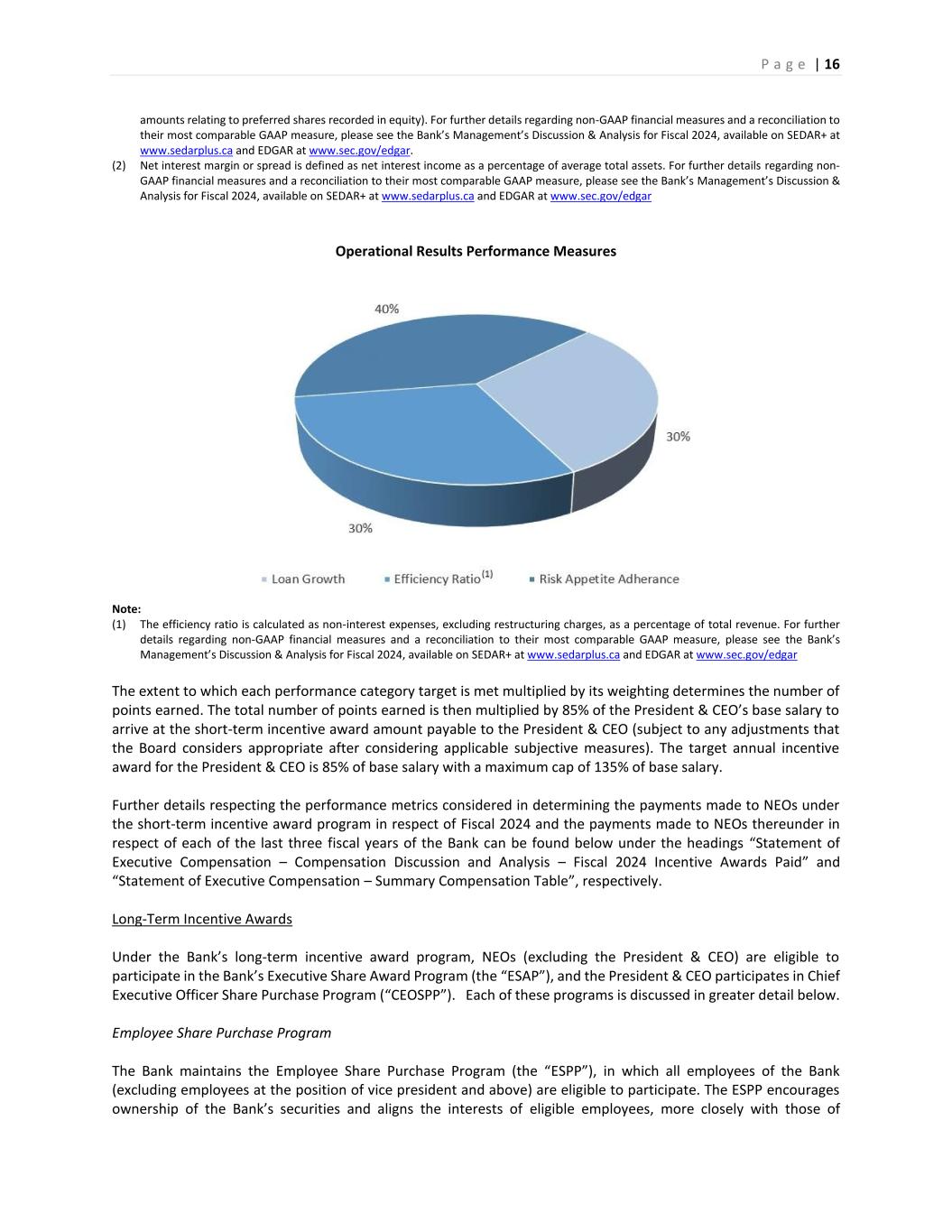 P a g e | 16 amounts relating to preferred shares recorded in equity). For further details regarding non-GAAP financial measures and a reconciliation to their most comparable GAAP measure, please see the Bank’s Management’s Discussion & Analysis for Fiscal 2024, available on SEDAR+ at www.sedarplus.ca and EDGAR at www.sec.gov/edgar. (2) Net interest margin or spread is defined as net interest income as a percentage of average total assets. For further details regarding non- GAAP financial measures and a reconciliation to their most comparable GAAP measure, please see the Bank’s Management’s Discussion & Analysis for Fiscal 2024, available on SEDAR+ at www.sedarplus.ca and EDGAR at www.sec.gov/edgar Operational Results Performance Measures Note: (1) The efficiency ratio is calculated as non-interest expenses, excluding restructuring charges, as a percentage of total revenue. For further details regarding non-GAAP financial measures and a reconciliation to their most comparable GAAP measure, please see the Bank’s Management’s Discussion & Analysis for Fiscal 2024, available on SEDAR+ at www.sedarplus.ca and EDGAR at www.sec.gov/edgar The extent to which each performance category target is met multiplied by its weighting determines the number of points earned. The total number of points earned is then multiplied by 85% of the President & CEO’s base salary to arrive at the short-term incentive award amount payable to the President & CEO (subject to any adjustments that the Board considers appropriate after considering applicable subjective measures). The target annual incentive award for the President & CEO is 85% of base salary with a maximum cap of 135% of base salary. Further details respecting the performance metrics considered in determining the payments made to NEOs under the short-term incentive award program in respect of Fiscal 2024 and the payments made to NEOs thereunder in respect of each of the last three fiscal years of the Bank can be found below under the headings “Statement of Executive Compensation – Compensation Discussion and Analysis – Fiscal 2024 Incentive Awards Paid” and “Statement of Executive Compensation – Summary Compensation Table”, respectively. Long-Term Incentive Awards Under the Bank’s long-term incentive award program, NEOs (excluding the President & CEO) are eligible to participate in the Bank’s Executive Share Award Program (the “ESAP”), and the President & CEO participates in Chief Executive Officer Share Purchase Program (“CEOSPP”). Each of these programs is discussed in greater detail below. Employee Share Purchase Program The Bank maintains the Employee Share Purchase Program (the “ESPP”), in which all employees of the Bank (excluding employees at the position of vice president and above) are eligible to participate. The ESPP encourages ownership of the Bank’s securities and aligns the interests of eligible employees, more closely with those of
