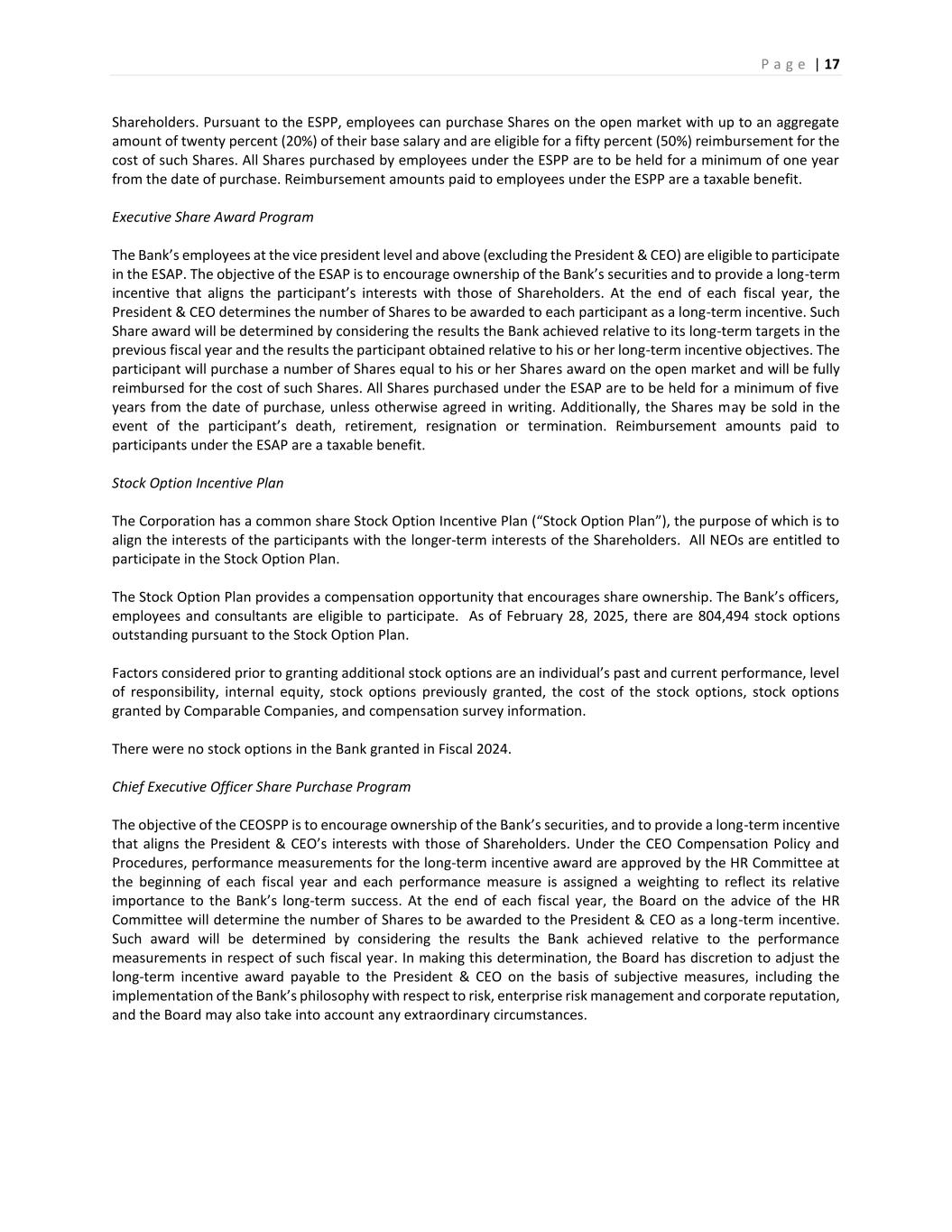 P a g e | 17 Shareholders. Pursuant to the ESPP, employees can purchase Shares on the open market with up to an aggregate amount of twenty percent (20%) of their base salary and are eligible for a fifty percent (50%) reimbursement for the cost of such Shares. All Shares purchased by employees under the ESPP are to be held for a minimum of one year from the date of purchase. Reimbursement amounts paid to employees under the ESPP are a taxable benefit. Executive Share Award Program The Bank’s employees at the vice president level and above (excluding the President & CEO) are eligible to participate in the ESAP. The objective of the ESAP is to encourage ownership of the Bank’s securities and to provide a long-term incentive that aligns the participant’s interests with those of Shareholders. At the end of each fiscal year, the President & CEO determines the number of Shares to be awarded to each participant as a long-term incentive. Such Share award will be determined by considering the results the Bank achieved relative to its long-term targets in the previous fiscal year and the results the participant obtained relative to his or her long-term incentive objectives. The participant will purchase a number of Shares equal to his or her Shares award on the open market and will be fully reimbursed for the cost of such Shares. All Shares purchased under the ESAP are to be held for a minimum of five years from the date of purchase, unless otherwise agreed in writing. Additionally, the Shares may be sold in the event of the participant’s death, retirement, resignation or termination. Reimbursement amounts paid to participants under the ESAP are a taxable benefit. Stock Option Incentive Plan The Corporation has a common share Stock Option Incentive Plan (“Stock Option Plan”), the purpose of which is to align the interests of the participants with the longer-term interests of the Shareholders. All NEOs are entitled to participate in the Stock Option Plan. The Stock Option Plan provides a compensation opportunity that encourages share ownership. The Bank’s officers, employees and consultants are eligible to participate. As of February 28, 2025, there are 804,494 stock options outstanding pursuant to the Stock Option Plan. Factors considered prior to granting additional stock options are an individual’s past and current performance, level of responsibility, internal equity, stock options previously granted, the cost of the stock options, stock options granted by Comparable Companies, and compensation survey information. There were no stock options in the Bank granted in Fiscal 2024. Chief Executive Officer Share Purchase Program The objective of the CEOSPP is to encourage ownership of the Bank’s securities, and to provide a long-term incentive that aligns the President & CEO’s interests with those of Shareholders. Under the CEO Compensation Policy and Procedures, performance measurements for the long-term incentive award are approved by the HR Committee at the beginning of each fiscal year and each performance measure is assigned a weighting to reflect its relative importance to the Bank’s long-term success. At the end of each fiscal year, the Board on the advice of the HR Committee will determine the number of Shares to be awarded to the President & CEO as a long-term incentive. Such award will be determined by considering the results the Bank achieved relative to the performance measurements in respect of such fiscal year. In making this determination, the Board has discretion to adjust the long-term incentive award payable to the President & CEO on the basis of subjective measures, including the implementation of the Bank’s philosophy with respect to risk, enterprise risk management and corporate reputation, and the Board may also take into account any extraordinary circumstances.