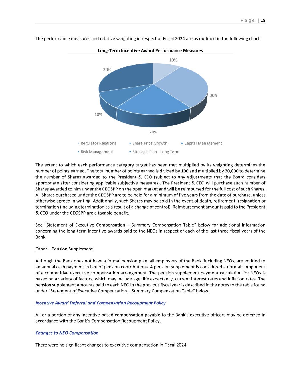 P a g e | 18 The performance measures and relative weighting in respect of Fiscal 2024 are as outlined in the following chart: Long-Term Incentive Award Performance Measures The extent to which each performance category target has been met multiplied by its weighting determines the number of points earned. The total number of points earned is divided by 100 and multiplied by 30,000 to determine the number of Shares awarded to the President & CEO (subject to any adjustments that the Board considers appropriate after considering applicable subjective measures). The President & CEO will purchase such number of Shares awarded to him under the CEOSPP on the open market and will be reimbursed for the full cost of such Shares. All Shares purchased under the CEOSPP are to be held for a minimum of five years from the date of purchase, unless otherwise agreed in writing. Additionally, such Shares may be sold in the event of death, retirement, resignation or termination (including termination as a result of a change of control). Reimbursement amounts paid to the President & CEO under the CEOSPP are a taxable benefit. See “Statement of Executive Compensation – Summary Compensation Table” below for additional information concerning the long-term incentive awards paid to the NEOs in respect of each of the last three fiscal years of the Bank. Other – Pension Supplement Although the Bank does not have a formal pension plan, all employees of the Bank, including NEOs, are entitled to an annual cash payment in lieu of pension contributions. A pension supplement is considered a normal component of a competitive executive compensation arrangement. The pension supplement payment calculation for NEOs is based on a variety of factors, which may include age, life expectancy, current interest rates and inflation rates. The pension supplement amounts paid to each NEO in the previous fiscal year is described in the notes to the table found under “Statement of Executive Compensation – Summary Compensation Table” below. Incentive Award Deferral and Compensation Recoupment Policy All or a portion of any incentive-based compensation payable to the Bank’s executive officers may be deferred in accordance with the Bank’s Compensation Recoupment Policy. Changes to NEO Compensation There were no significant changes to executive compensation in Fiscal 2024.