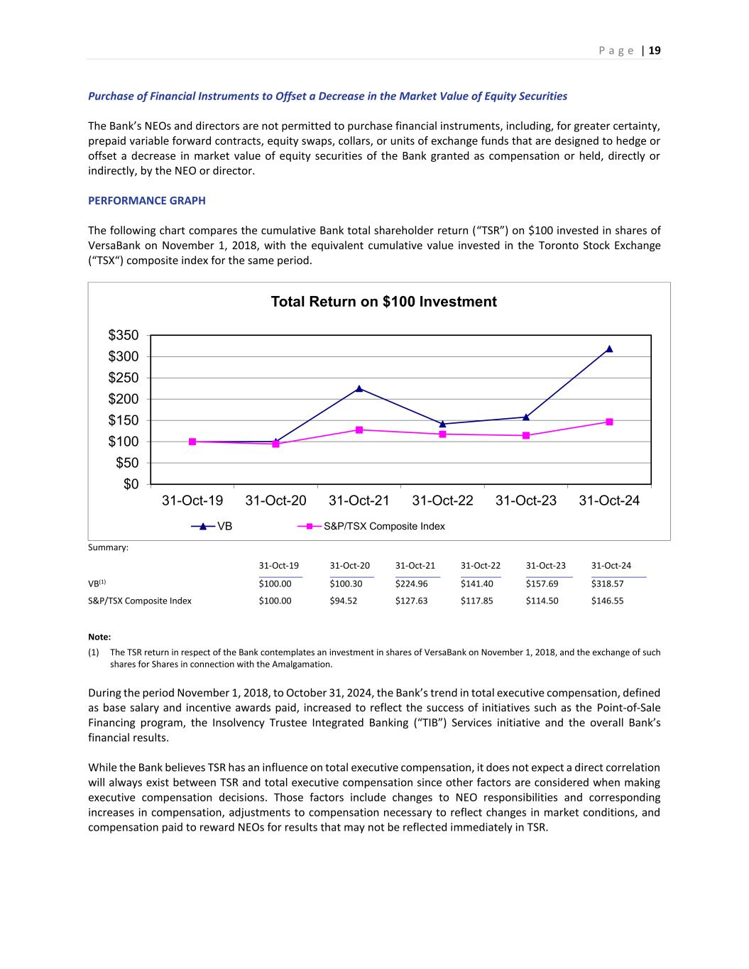 P a g e | 19 Purchase of Financial Instruments to Offset a Decrease in the Market Value of Equity Securities The Bank’s NEOs and directors are not permitted to purchase financial instruments, including, for greater certainty, prepaid variable forward contracts, equity swaps, collars, or units of exchange funds that are designed to hedge or offset a decrease in market value of equity securities of the Bank granted as compensation or held, directly or indirectly, by the NEO or director. PERFORMANCE GRAPH The following chart compares the cumulative Bank total shareholder return (“TSR”) on $100 invested in shares of VersaBank on November 1, 2018, with the equivalent cumulative value invested in the Toronto Stock Exchange (“TSX“) composite index for the same period. Summary: 31-Oct-19 31-Oct-20 31-Oct-21 31-Oct-22 31-Oct-23 31-Oct-24 VB(1) $100.00 $100.30 $224.96 $141.40 $157.69 $318.57 S&P/TSX Composite Index $100.00 $94.52 $127.63 $117.85 $114.50 $146.55 Note: (1) The TSR return in respect of the Bank contemplates an investment in shares of VersaBank on November 1, 2018, and the exchange of such shares for Shares in connection with the Amalgamation. During the period November 1, 2018, to October 31, 2024, the Bank’s trend in total executive compensation, defined as base salary and incentive awards paid, increased to reflect the success of initiatives such as the Point-of-Sale Financing program, the Insolvency Trustee Integrated Banking (“TIB”) Services initiative and the overall Bank’s financial results. While the Bank believes TSR has an influence on total executive compensation, it does not expect a direct correlation will always exist between TSR and total executive compensation since other factors are considered when making executive compensation decisions. Those factors include changes to NEO responsibilities and corresponding increases in compensation, adjustments to compensation necessary to reflect changes in market conditions, and compensation paid to reward NEOs for results that may not be reflected immediately in TSR. $0 $50 $100 $150 $200 $250 $300 $350 31-Oct-19 31-Oct-20 31-Oct-21 31-Oct-22 31-Oct-23 31-Oct-24 Total Return on $100 Investment VB S&P/TSX Composite Index