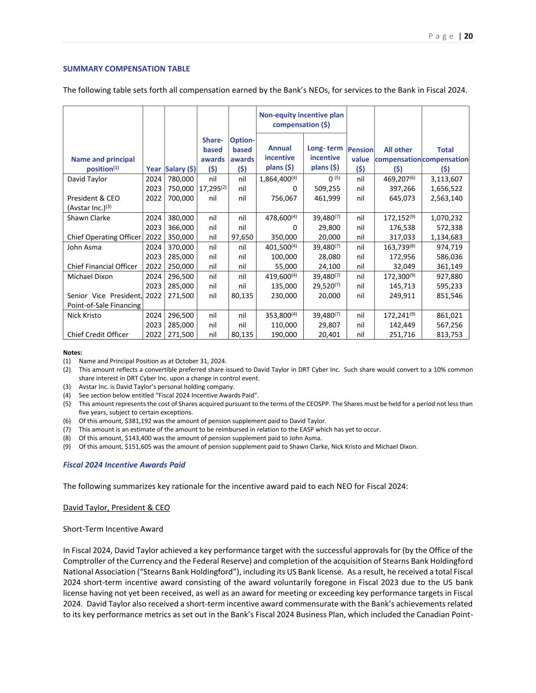 P a g e | 20 SUMMARY COMPENSATION TABLE The following table sets forth all compensation earned by the Bank’s NEOs, for services to the Bank in Fiscal 2024. Name and principal position(1) Year Salary ($) Share- based awards ($) Option- based awards ($) Non-equity incentive plan compensation ($) Pension value ($) All other compensation ($) Total compensation ($) Annual incentive plans ($) Long- term incentive plans ($) David Taylor President & CEO (Avstar Inc.)(3) 2024 2023 2022 780,000 750,000 700,000 nil 17,295(2) nil nil nil nil 1,864,400(4) 0 756,067 0 (5) 509,255 461,999 nil nil nil 469,207(6) 397,266 645,073 3,113,607 1,656,522 2,563,140 Shawn Clarke Chief Operating Officer 2024 2023 2022 380,000 366,000 350,000 nil nil nil nil nil 97,650 478,600(4) 0 350,000 39,480(7) 29,800 20,000 nil nil nil 172,152(9) 176,538 317,033 1,070,232 572,338 1,134,683 John Asma Chief Financial Officer 2024 2023 2022 370,000 285,000 250,000 nil nil nil nil nil nil 401,500(4) 100,000 55,000 39,480(7) 28,080 24,100 nil nil nil 163,739(8) 172,956 32,049 974,719 586,036 361,149 Michael Dixon Senior Vice President, Point-of-Sale Financing 2024 2023 2022 296,500 285,000 271,500 nil nil nil nil nil 80,135 419,600(4) 135,000 230,000 39,480(7) 29,520(7) 20,000 nil nil nil 172,300(9) 145,713 249,911 927,880 595,233 851,546 Nick Kristo Chief Credit Officer 2024 2023 2022 296,500 285,000 271,500 nil nil nil nil nil 80,135 353,800(4) 110,000 190,000 39,480(7) 29,807 20,401 nil nil nil 172,241(9) 142,449 251,716 861,021 567,256 813,753 Notes: (1) Name and Principal Position as at October 31, 2024. (2) This amount reflects a convertible preferred share issued to David Taylor in DRT Cyber Inc. Such share would convert to a 10% common share interest in DRT Cyber Inc. upon a change in control event. (3) Avstar Inc. is David Taylor’s personal holding company. (4) See section below entitled “Fiscal 2024 Incentive Awards Paid”. (5) This amount represents the cost of Shares acquired pursuant to the terms of the CEOSPP. The Shares must be held for a period not less than five years, subject to certain exceptions. (6) Of this amount, $381,192 was the amount of pension supplement paid to David Taylor. (7) This amount is an estimate of the amount to be reimbursed in relation to the EASP which has yet to occur. (8) Of this amount, $143,400 was the amount of pension supplement paid to John Asma. (9) Of this amount, $151,605 was the amount of pension supplement paid to Shawn Clarke, Nick Kristo and Michael Dixon. Fiscal 2024 Incentive Awards Paid The following summarizes key rationale for the incentive award paid to each NEO for Fiscal 2024: David Taylor, President & CEO Short-Term Incentive Award In Fiscal 2024, David Taylor achieved a key performance target with the successful approvals for (by the Office of the Comptroller of the Currency and the Federal Reserve) and completion of the acquisition of Stearns Bank Holdingford National Association (“Stearns Bank Holdingford”), including its US Bank license. As a result, he received a total Fiscal 2024 short-term incentive award consisting of the award voluntarily foregone in Fiscal 2023 due to the US bank license having not yet been received, as well as an award for meeting or exceeding key performance targets in Fiscal 2024. David Taylor also received a short-term incentive award commensurate with the Bank’s achievements related to its key performance metrics as set out in the Bank’s Fiscal 2024 Business Plan, which included the Canadian Point-