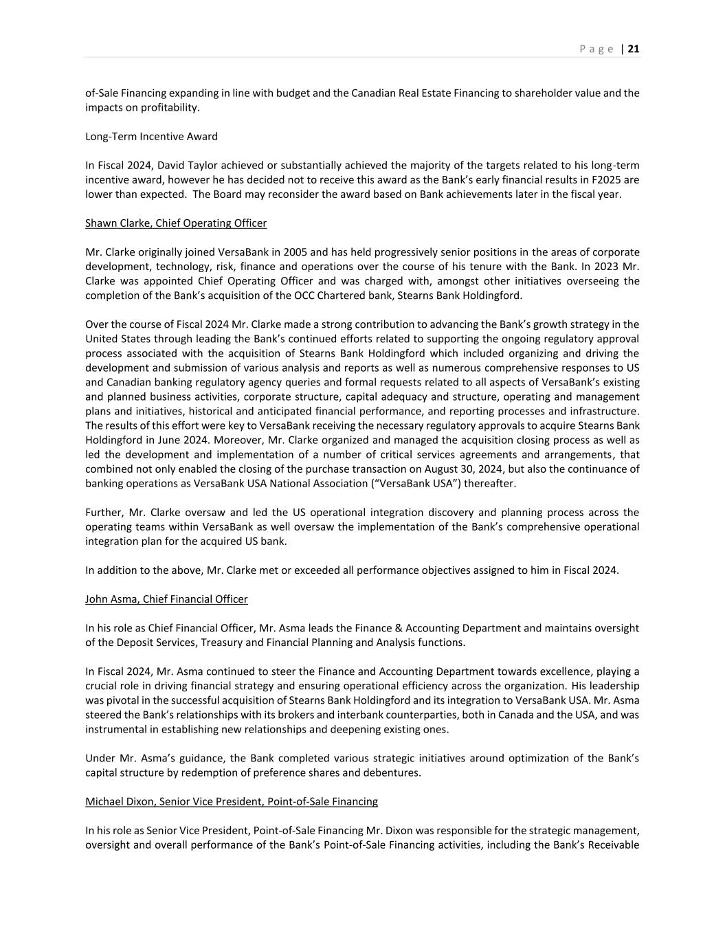 P a g e | 21 of-Sale Financing expanding in line with budget and the Canadian Real Estate Financing to shareholder value and the impacts on profitability. Long-Term Incentive Award In Fiscal 2024, David Taylor achieved or substantially achieved the majority of the targets related to his long-term incentive award, however he has decided not to receive this award as the Bank’s early financial results in F2025 are lower than expected. The Board may reconsider the award based on Bank achievements later in the fiscal year. Shawn Clarke, Chief Operating Officer Mr. Clarke originally joined VersaBank in 2005 and has held progressively senior positions in the areas of corporate development, technology, risk, finance and operations over the course of his tenure with the Bank. In 2023 Mr. Clarke was appointed Chief Operating Officer and was charged with, amongst other initiatives overseeing the completion of the Bank’s acquisition of the OCC Chartered bank, Stearns Bank Holdingford. Over the course of Fiscal 2024 Mr. Clarke made a strong contribution to advancing the Bank’s growth strategy in the United States through leading the Bank’s continued efforts related to supporting the ongoing regulatory approval process associated with the acquisition of Stearns Bank Holdingford which included organizing and driving the development and submission of various analysis and reports as well as numerous comprehensive responses to US and Canadian banking regulatory agency queries and formal requests related to all aspects of VersaBank’s existing and planned business activities, corporate structure, capital adequacy and structure, operating and management plans and initiatives, historical and anticipated financial performance, and reporting processes and infrastructure. The results of this effort were key to VersaBank receiving the necessary regulatory approvals to acquire Stearns Bank Holdingford in June 2024. Moreover, Mr. Clarke organized and managed the acquisition closing process as well as led the development and implementation of a number of critical services agreements and arrangements, that combined not only enabled the closing of the purchase transaction on August 30, 2024, but also the continuance of banking operations as VersaBank USA National Association (“VersaBank USA”) thereafter. Further, Mr. Clarke oversaw and led the US operational integration discovery and planning process across the operating teams within VersaBank as well oversaw the implementation of the Bank’s comprehensive operational integration plan for the acquired US bank. In addition to the above, Mr. Clarke met or exceeded all performance objectives assigned to him in Fiscal 2024. John Asma, Chief Financial Officer In his role as Chief Financial Officer, Mr. Asma leads the Finance & Accounting Department and maintains oversight of the Deposit Services, Treasury and Financial Planning and Analysis functions. In Fiscal 2024, Mr. Asma continued to steer the Finance and Accounting Department towards excellence, playing a crucial role in driving financial strategy and ensuring operational efficiency across the organization. His leadership was pivotal in the successful acquisition of Stearns Bank Holdingford and its integration to VersaBank USA. Mr. Asma steered the Bank’s relationships with its brokers and interbank counterparties, both in Canada and the USA, and was instrumental in establishing new relationships and deepening existing ones. Under Mr. Asma’s guidance, the Bank completed various strategic initiatives around optimization of the Bank’s capital structure by redemption of preference shares and debentures. Michael Dixon, Senior Vice President, Point-of-Sale Financing In his role as Senior Vice President, Point-of-Sale Financing Mr. Dixon was responsible for the strategic management, oversight and overall performance of the Bank’s Point-of-Sale Financing activities, including the Bank’s Receivable