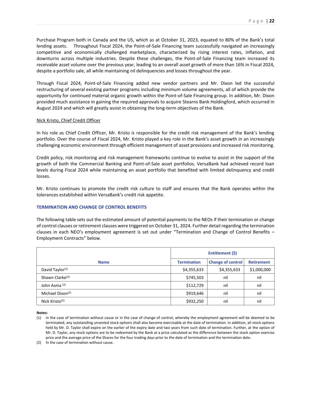 P a g e | 22 Purchase Program both in Canada and the US, which as at October 31, 2023, equated to 80% of the Bank’s total lending assets. Throughout Fiscal 2024, the Point-of-Sale Financing team successfully navigated an increasingly competitive and economically challenged marketplace, characterized by rising interest rates, inflation, and downturns across multiple industries. Despite these challenges, the Point-of-Sale Financing team increased its receivable asset volume over the previous year, leading to an overall asset growth of more than 16% in Fiscal 2024, despite a portfolio sale, all while maintaining nil delinquencies and losses throughout the year. Through Fiscal 2024, Point-of-Sale Financing added new vendor partners and Mr. Dixon led the successful restructuring of several existing partner programs including minimum volume agreements, all of which provide the opportunity for continued material organic growth within the Point-of-Sale Financing group. In addition, Mr. Dixon provided much assistance in gaining the required approvals to acquire Stearns Bank Holdingford, which occurred in August 2024 and which will greatly assist in obtaining the long-term objectives of the Bank. Nick Kristo, Chief Credit Officer In his role as Chief Credit Officer, Mr. Kristo is responsible for the credit risk management of the Bank’s lending portfolio. Over the course of Fiscal 2024, Mr. Kristo played a key role in the Bank’s asset growth in an increasingly challenging economic environment through efficient management of asset provisions and increased risk monitoring. Credit policy, risk monitoring and risk management frameworks continue to evolve to assist in the support of the growth of both the Commercial Banking and Point-of-Sale asset portfolios. VersaBank had achieved record loan levels during Fiscal 2024 while maintaining an asset portfolio that benefited with limited delinquency and credit losses. Mr. Kristo continues to promote the credit risk culture to staff and ensures that the Bank operates within the tolerances established within VersaBank’s credit risk appetite. TERMINATION AND CHANGE OF CONTROL BENEFITS The following table sets out the estimated amount of potential payments to the NEOs if their termination or change of control clauses or retirement clauses were triggered on October 31, 2024. Further detail regarding the termination clauses in each NEO’s employment agreement is set out under “Termination and Change of Control Benefits – Employment Contracts” below. Name Entitlement ($) Termination Change of control Retirement David Taylor(1) $4,355,633 $4,355,633 $1,000,000 Shawn Clarke(2) $745,503 nil nil John Asma (2) $112,729 nil nil Michael Dixon(2) $919,646 nil nil Nick Kristo(2) $932,250 nil nil Notes: (1) In the case of termination without cause or in the case of change of control, whereby the employment agreement will be deemed to be terminated, any outstanding unvested stock options shall also become exercisable at the date of termination. In addition, all stock options held by Mr. D. Taylor shall expire on the earlier of the expiry date and two years from such date of termination. Further, at the option of Mr. D. Taylor, any stock options are to be redeemed by the Bank at a price calculated as the difference between the stock option exercise price and the average price of the Shares for the four trading days prior to the date of termination and the termination date. (2) In the case of termination without cause.