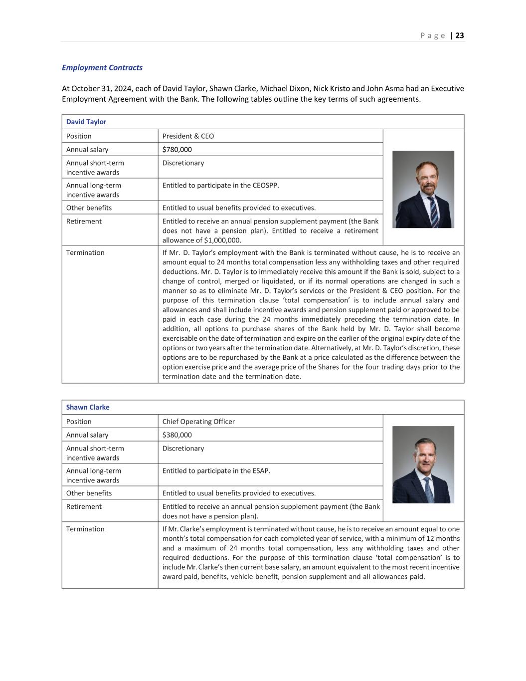 P a g e | 23 Employment Contracts At October 31, 2024, each of David Taylor, Shawn Clarke, Michael Dixon, Nick Kristo and John Asma had an Executive Employment Agreement with the Bank. The following tables outline the key terms of such agreements. David Taylor Position President & CEO Annual salary $780,000 Annual short-term incentive awards Discretionary Annual long-term incentive awards Entitled to participate in the CEOSPP. Other benefits Entitled to usual benefits provided to executives. Retirement Entitled to receive an annual pension supplement payment (the Bank does not have a pension plan). Entitled to receive a retirement allowance of $1,000,000. Termination If Mr. D. Taylor’s employment with the Bank is terminated without cause, he is to receive an amount equal to 24 months total compensation less any withholding taxes and other required deductions. Mr. D. Taylor is to immediately receive this amount if the Bank is sold, subject to a change of control, merged or liquidated, or if its normal operations are changed in such a manner so as to eliminate Mr. D. Taylor’s services or the President & CEO position. For the purpose of this termination clause ‘total compensation’ is to include annual salary and allowances and shall include incentive awards and pension supplement paid or approved to be paid in each case during the 24 months immediately preceding the termination date. In addition, all options to purchase shares of the Bank held by Mr. D. Taylor shall become exercisable on the date of termination and expire on the earlier of the original expiry date of the options or two years after the termination date. Alternatively, at Mr. D. Taylor’s discretion, these options are to be repurchased by the Bank at a price calculated as the difference between the option exercise price and the average price of the Shares for the four trading days prior to the termination date and the termination date. Shawn Clarke Position Chief Operating Officer Annual salary $380,000 Annual short-term incentive awards Discretionary Annual long-term incentive awards Entitled to participate in the ESAP. Other benefits Entitled to usual benefits provided to executives. Retirement Entitled to receive an annual pension supplement payment (the Bank does not have a pension plan). Termination If Mr. Clarke’s employment is terminated without cause, he is to receive an amount equal to one month’s total compensation for each completed year of service, with a minimum of 12 months and a maximum of 24 months total compensation, less any withholding taxes and other required deductions. For the purpose of this termination clause ‘total compensation’ is to include Mr. Clarke’s then current base salary, an amount equivalent to the most recent incentive award paid, benefits, vehicle benefit, pension supplement and all allowances paid.