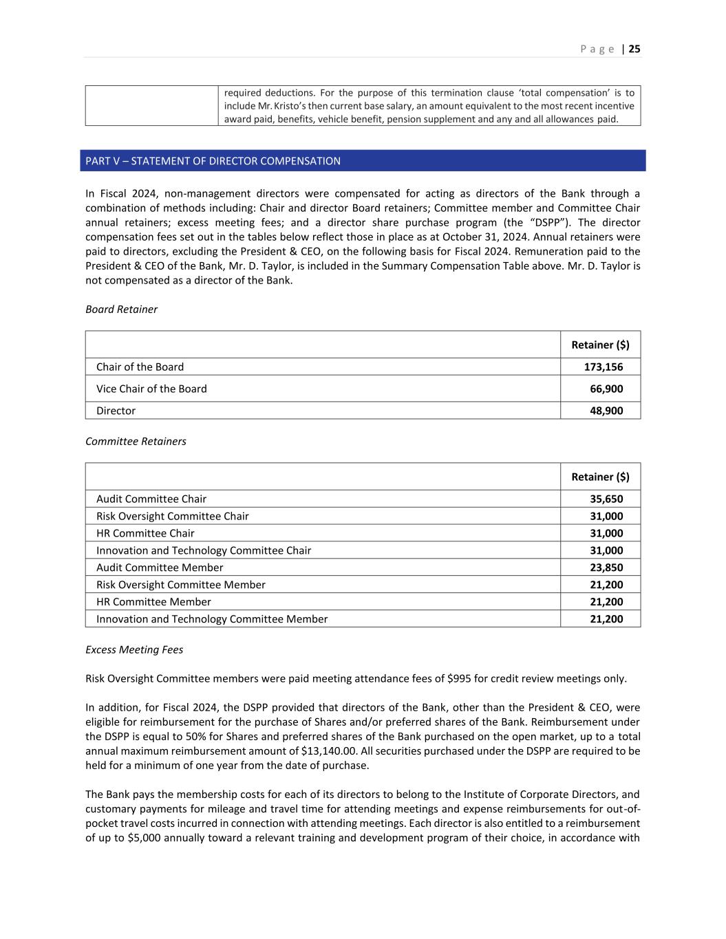 P a g e | 25 required deductions. For the purpose of this termination clause ‘total compensation’ is to include Mr. Kristo’s then current base salary, an amount equivalent to the most recent incentive award paid, benefits, vehicle benefit, pension supplement and any and all allowances paid. PART V – STATEMENT OF DIRECTOR COMPENSATION In Fiscal 2024, non-management directors were compensated for acting as directors of the Bank through a combination of methods including: Chair and director Board retainers; Committee member and Committee Chair annual retainers; excess meeting fees; and a director share purchase program (the “DSPP”). The director compensation fees set out in the tables below reflect those in place as at October 31, 2024. Annual retainers were paid to directors, excluding the President & CEO, on the following basis for Fiscal 2024. Remuneration paid to the President & CEO of the Bank, Mr. D. Taylor, is included in the Summary Compensation Table above. Mr. D. Taylor is not compensated as a director of the Bank. Board Retainer Retainer ($) Chair of the Board 173,156 Vice Chair of the Board 66,900 Director 48,900 Committee Retainers Retainer ($) Audit Committee Chair 35,650 Risk Oversight Committee Chair 31,000 HR Committee Chair 31,000 Innovation and Technology Committee Chair 31,000 Audit Committee Member 23,850 Risk Oversight Committee Member 21,200 HR Committee Member 21,200 Innovation and Technology Committee Member 21,200 Excess Meeting Fees Risk Oversight Committee members were paid meeting attendance fees of $995 for credit review meetings only. In addition, for Fiscal 2024, the DSPP provided that directors of the Bank, other than the President & CEO, were eligible for reimbursement for the purchase of Shares and/or preferred shares of the Bank. Reimbursement under the DSPP is equal to 50% for Shares and preferred shares of the Bank purchased on the open market, up to a total annual maximum reimbursement amount of $13,140.00. All securities purchased under the DSPP are required to be held for a minimum of one year from the date of purchase. The Bank pays the membership costs for each of its directors to belong to the Institute of Corporate Directors, and customary payments for mileage and travel time for attending meetings and expense reimbursements for out-of- pocket travel costs incurred in connection with attending meetings. Each director is also entitled to a reimbursement of up to $5,000 annually toward a relevant training and development program of their choice, in accordance with