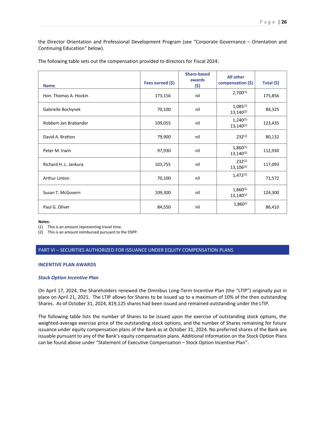 P a g e | 26 the Director Orientation and Professional Development Program (see “Corporate Governance – Orientation and Continuing Education” below). The following table sets out the compensation provided to directors for Fiscal 2024: Name Fees earned ($) Share-based awards ($) All other compensation ($) Total ($) Hon. Thomas A. Hockin 173,156 nil 2,700(1) 175,856 Gabrielle Bochynek 70,100 nil 1,085(1) 13,140(2) 84,325 Robbert-Jan Brabander 109,055 nil 1,240(1) 13,140(2) 123,435 David A. Bratton 79,900 nil 232(1) 80,132 Peter M. Irwin 97,930 nil 1,860(1) 13,140(2) 112,930 Richard H. L. Jankura 103,755 nil 232(1) 13,106(2) 117,093 Arthur Linton 70,100 nil 1,472(1) 71,572 Susan T. McGovern 109,300 nil 1,860(1) 13,140(2) 124,300 Paul G. Oliver 84,550 nil 1,8601) 86,410 Notes: (1) This is an amount representing travel time. (2) This is an amount reimbursed pursuant to the DSPP. PART VI – SECURITIES AUTHORIZED FOR ISSUANCE UNDER EQUITY COMPENSATION PLANS INCENTIVE PLAN AWARDS Stock Option Incentive Plan On April 17, 2024, the Shareholders renewed the Omnibus Long-Term Incentive Plan (the “LTIP”) originally put in place on April 21, 2021. The LTIP allows for Shares to be issued up to a maximum of 10% of the then outstanding Shares. As of October 31, 2024, 819,125 shares had been issued and remained outstanding under the LTIP. The following table lists the number of Shares to be issued upon the exercise of outstanding stock options, the weighted-average exercise price of the outstanding stock options, and the number of Shares remaining for future issuance under equity compensation plans of the Bank as at October 31, 2024. No preferred shares of the Bank are issuable pursuant to any of the Bank’s equity compensation plans. Additional information on the Stock Option Plans can be found above under “Statement of Executive Compensation – Stock Option Incentive Plan”.