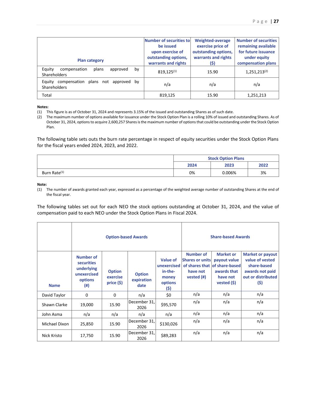 P a g e | 27 Plan category Number of securities to be issued upon exercise of outstanding options, warrants and rights Weighted-average exercise price of outstanding options, warrants and rights ($) Number of securities remaining available for future issuance under equity compensation plans Equity compensation plans approved by Shareholders 819,125(1) 15.90 1,251,213(2) Equity compensation plans not approved by Shareholders n/a n/a n/a Total 819,125 15.90 1,251,213 Notes: (1) This figure is as of October 31, 2024 and represents 3.15% of the issued and outstanding Shares as of such date. (2) The maximum number of options available for issuance under the Stock Option Plan is a rolling 10% of issued and outstanding Shares. As of October 31, 2024, options to acquire 2,600,257 Shares is the maximum number of options that could be outstanding under the Stock Option Plan. The following table sets outs the burn rate percentage in respect of equity securities under the Stock Option Plans for the fiscal years ended 2024, 2023, and 2022. Stock Option Plans 2024 2023 2022 Burn Rate(1) 0% 0.006% 3% Note: (1) The number of awards granted each year, expressed as a percentage of the weighted average number of outstanding Shares at the end of the fiscal year. The following tables set out for each NEO the stock options outstanding at October 31, 2024, and the value of compensation paid to each NEO under the Stock Option Plans in Fiscal 2024. Option-based Awards Share-based Awards Name Number of securities underlying unexercised options (#) Option exercise price ($) Option expiration date Value of unexercised in-the- money options ($) Number of Shares or units of shares that have not vested (#) Market or payout value of share-based awards that have not vested ($) Market or payout value of vested share-based awards not paid out or distributed ($) David Taylor 0 0 n/a $0 n/a n/a n/a Shawn Clarke 19,000 15.90 December 31, 2026 $95,570 n/a n/a n/a John Asma n/a n/a n/a n/a n/a n/a n/a Michael Dixon 25,850 15.90 December 31, 2026 $130,026 n/a n/a n/a Nick Kristo 17,750 15.90 December 31, 2026 $89,283 n/a n/a n/a