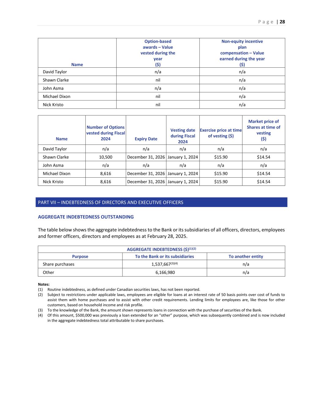 P a g e | 28 Option-based Non-equity incentive awards – Value plan vested during the compensation – Value year earned during the year Name ($) ($) David Taylor n/a n/a Shawn Clarke nil n/a John Asma n/a n/a Michael Dixon nil n/a Nick Kristo nil n/a Name Number of Options vested during Fiscal 2024 Expiry Date Vesting date during Fiscal 2024 Exercise price at time of vesting ($) Market price of Shares at time of vesting ($) David Taylor n/a n/a n/a n/a n/a Shawn Clarke 10,500 December 31, 2026 January 1, 2024 $15.90 $14.54 John Asma n/a n/a n/a n/a n/a Michael Dixon 8,616 December 31, 2026 January 1, 2024 $15.90 $14.54 Nick Kristo 8,616 December 31, 2026 January 1, 2024 $15.90 $14.54 PART VII – INDEBTEDNESS OF DIRECTORS AND EXECUTIVE OFFICERS AGGREGATE INDEBTEDNESS OUTSTANDING The table below shows the aggregate indebtedness to the Bank or its subsidiaries of all officers, directors, employees and former officers, directors and employees as at February 28, 2025. AGGREGATE INDEBTEDNESS ($)(1)(2) Purpose To the Bank or its subsidiaries To another entity Share purchases 1,537,667(3)(4) n/a Other 6,166,980 n/a Notes: (1) Routine indebtedness, as defined under Canadian securities laws, has not been reported. (2) Subject to restrictions under applicable laws, employees are eligible for loans at an interest rate of 50 basis points over cost of funds to assist them with home purchases and to assist with other credit requirements. Lending limits for employees are, like those for other customers, based on household income and risk profile. (3) To the knowledge of the Bank, the amount shown represents loans in connection with the purchase of securities of the Bank. (4) Of this amount, $500,000 was previously a loan extended for an “other” purpose, which was subsequently combined and is now included in the aggregate indebtedness total attributable to share purchases.