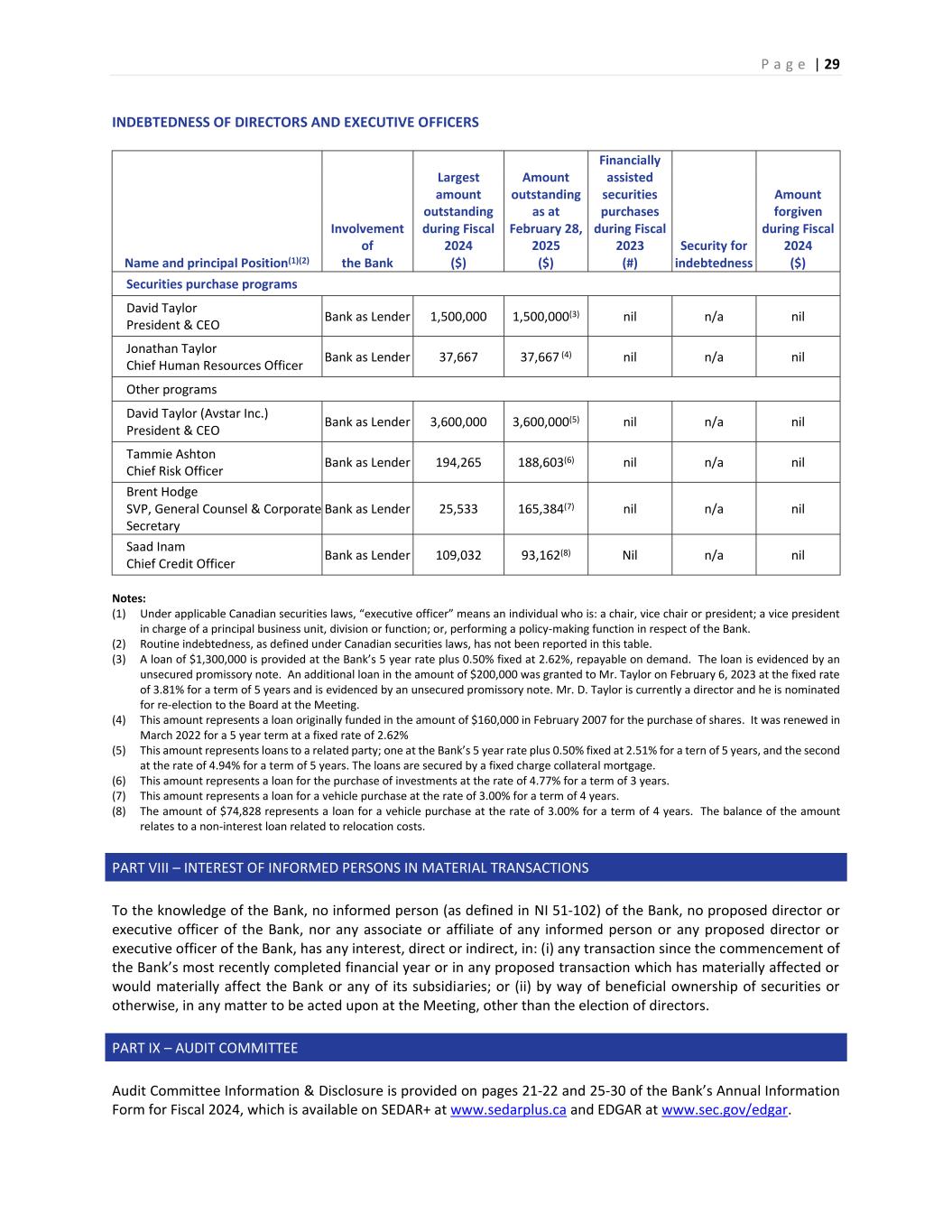 P a g e | 29 INDEBTEDNESS OF DIRECTORS AND EXECUTIVE OFFICERS Financially Largest Amount assisted amount outstanding securities Amount outstanding as at purchases forgiven Involvement during Fiscal February 28, during Fiscal during Fiscal of 2024 2025 2023 Security for 2024 Name and principal Position(1)(2) the Bank ($) ($) (#) indebtedness ($) Securities purchase programs David Taylor President & CEO Bank as Lender 1,500,000 1,500,000(3) nil n/a nil Jonathan Taylor Chief Human Resources Officer Bank as Lender 37,667 37,667 (4) nil n/a nil Other programs David Taylor (Avstar Inc.) President & CEO Bank as Lender 3,600,000 3,600,000(5) nil n/a nil Tammie Ashton Chief Risk Officer Bank as Lender 194,265 188,603(6) nil n/a nil Brent Hodge SVP, General Counsel & Corporate Secretary Bank as Lender 25,533 165,384(7) nil n/a nil Saad Inam Chief Credit Officer Bank as Lender 109,032 93,162(8) Nil n/a nil Notes: (1) Under applicable Canadian securities laws, “executive officer” means an individual who is: a chair, vice chair or president; a vice president in charge of a principal business unit, division or function; or, performing a policy-making function in respect of the Bank. (2) Routine indebtedness, as defined under Canadian securities laws, has not been reported in this table. (3) A loan of $1,300,000 is provided at the Bank’s 5 year rate plus 0.50% fixed at 2.62%, repayable on demand. The loan is evidenced by an unsecured promissory note. An additional loan in the amount of $200,000 was granted to Mr. Taylor on February 6, 2023 at the fixed rate of 3.81% for a term of 5 years and is evidenced by an unsecured promissory note. Mr. D. Taylor is currently a director and he is nominated for re-election to the Board at the Meeting. (4) This amount represents a loan originally funded in the amount of $160,000 in February 2007 for the purchase of shares. It was renewed in March 2022 for a 5 year term at a fixed rate of 2.62% (5) This amount represents loans to a related party; one at the Bank’s 5 year rate plus 0.50% fixed at 2.51% for a tern of 5 years, and the second at the rate of 4.94% for a term of 5 years. The loans are secured by a fixed charge collateral mortgage. (6) This amount represents a loan for the purchase of investments at the rate of 4.77% for a term of 3 years. (7) This amount represents a loan for a vehicle purchase at the rate of 3.00% for a term of 4 years. (8) The amount of $74,828 represents a loan for a vehicle purchase at the rate of 3.00% for a term of 4 years. The balance of the amount relates to a non-interest loan related to relocation costs. PART VIII – INTEREST OF INFORMED PERSONS IN MATERIAL TRANSACTIONS To the knowledge of the Bank, no informed person (as defined in NI 51-102) of the Bank, no proposed director or executive officer of the Bank, nor any associate or affiliate of any informed person or any proposed director or executive officer of the Bank, has any interest, direct or indirect, in: (i) any transaction since the commencement of the Bank’s most recently completed financial year or in any proposed transaction which has materially affected or would materially affect the Bank or any of its subsidiaries; or (ii) by way of beneficial ownership of securities or otherwise, in any matter to be acted upon at the Meeting, other than the election of directors. PART IX – AUDIT COMMITTEE Audit Committee Information & Disclosure is provided on pages 21-22 and 25-30 of the Bank’s Annual Information Form for Fiscal 2024, which is available on SEDAR+ at www.sedarplus.ca and EDGAR at www.sec.gov/edgar.