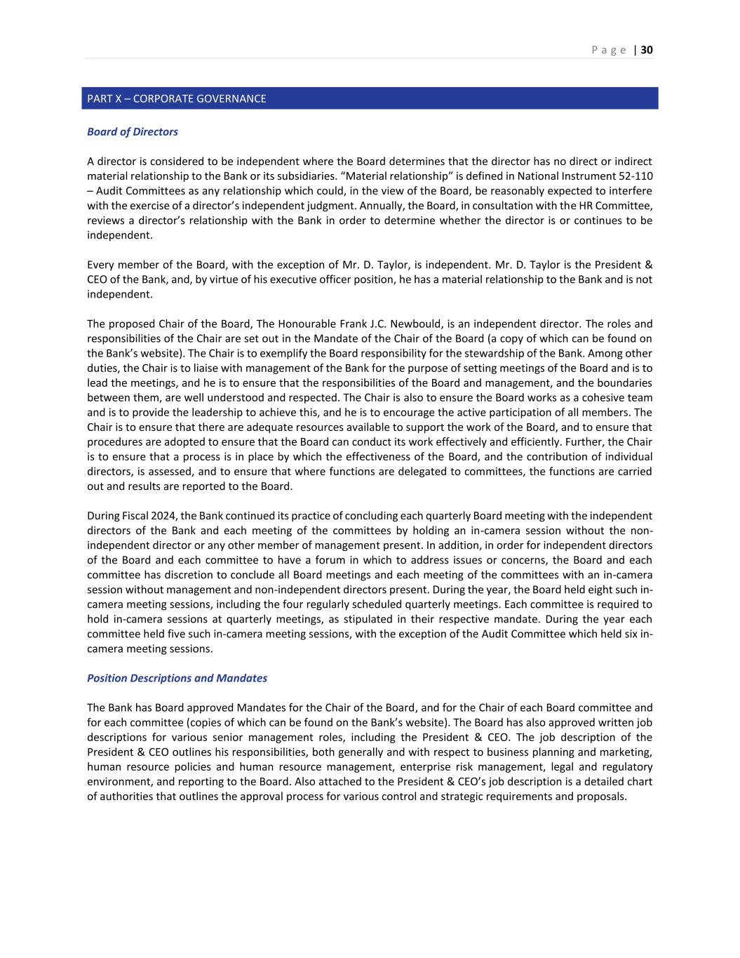 P a g e | 30 PART X – CORPORATE GOVERNANCE Board of Directors A director is considered to be independent where the Board determines that the director has no direct or indirect material relationship to the Bank or its subsidiaries. “Material relationship” is defined in National Instrument 52-110 – Audit Committees as any relationship which could, in the view of the Board, be reasonably expected to interfere with the exercise of a director’s independent judgment. Annually, the Board, in consultation with the HR Committee, reviews a director’s relationship with the Bank in order to determine whether the director is or continues to be independent. Every member of the Board, with the exception of Mr. D. Taylor, is independent. Mr. D. Taylor is the President & CEO of the Bank, and, by virtue of his executive officer position, he has a material relationship to the Bank and is not independent. The proposed Chair of the Board, The Honourable Frank J.C. Newbould, is an independent director. The roles and responsibilities of the Chair are set out in the Mandate of the Chair of the Board (a copy of which can be found on the Bank’s website). The Chair is to exemplify the Board responsibility for the stewardship of the Bank. Among other duties, the Chair is to liaise with management of the Bank for the purpose of setting meetings of the Board and is to lead the meetings, and he is to ensure that the responsibilities of the Board and management, and the boundaries between them, are well understood and respected. The Chair is also to ensure the Board works as a cohesive team and is to provide the leadership to achieve this, and he is to encourage the active participation of all members. The Chair is to ensure that there are adequate resources available to support the work of the Board, and to ensure that procedures are adopted to ensure that the Board can conduct its work effectively and efficiently. Further, the Chair is to ensure that a process is in place by which the effectiveness of the Board, and the contribution of individual directors, is assessed, and to ensure that where functions are delegated to committees, the functions are carried out and results are reported to the Board. During Fiscal 2024, the Bank continued its practice of concluding each quarterly Board meeting with the independent directors of the Bank and each meeting of the committees by holding an in-camera session without the non- independent director or any other member of management present. In addition, in order for independent directors of the Board and each committee to have a forum in which to address issues or concerns, the Board and each committee has discretion to conclude all Board meetings and each meeting of the committees with an in-camera session without management and non-independent directors present. During the year, the Board held eight such in- camera meeting sessions, including the four regularly scheduled quarterly meetings. Each committee is required to hold in-camera sessions at quarterly meetings, as stipulated in their respective mandate. During the year each committee held five such in-camera meeting sessions, with the exception of the Audit Committee which held six in- camera meeting sessions. Position Descriptions and Mandates The Bank has Board approved Mandates for the Chair of the Board, and for the Chair of each Board committee and for each committee (copies of which can be found on the Bank’s website). The Board has also approved written job descriptions for various senior management roles, including the President & CEO. The job description of the President & CEO outlines his responsibilities, both generally and with respect to business planning and marketing, human resource policies and human resource management, enterprise risk management, legal and regulatory environment, and reporting to the Board. Also attached to the President & CEO’s job description is a detailed chart of authorities that outlines the approval process for various control and strategic requirements and proposals.