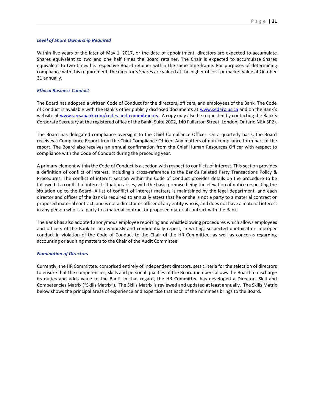 P a g e | 31 Level of Share Ownership Required Within five years of the later of May 1, 2017, or the date of appointment, directors are expected to accumulate Shares equivalent to two and one half times the Board retainer. The Chair is expected to accumulate Shares equivalent to two times his respective Board retainer within the same time frame. For purposes of determining compliance with this requirement, the director’s Shares are valued at the higher of cost or market value at October 31 annually. Ethical Business Conduct The Board has adopted a written Code of Conduct for the directors, officers, and employees of the Bank. The Code of Conduct is available with the Bank’s other publicly disclosed documents at www.sedarplus.ca and on the Bank’s website at www.versabank.com/codes-and-commitments. A copy may also be requested by contacting the Bank’s Corporate Secretary at the registered office of the Bank (Suite 2002, 140 Fullarton Street, London, Ontario N6A 5P2). The Board has delegated compliance oversight to the Chief Compliance Officer. On a quarterly basis, the Board receives a Compliance Report from the Chief Compliance Officer. Any matters of non-compliance form part of the report. The Board also receives an annual confirmation from the Chief Human Resources Officer with respect to compliance with the Code of Conduct during the preceding year. A primary element within the Code of Conduct is a section with respect to conflicts of interest. This section provides a definition of conflict of interest, including a cross-reference to the Bank’s Related Party Transactions Policy & Procedures. The conflict of interest section within the Code of Conduct provides details on the procedure to be followed if a conflict of interest situation arises, with the basic premise being the elevation of notice respecting the situation up to the Board. A list of conflict of interest matters is maintained by the legal department, and each director and officer of the Bank is required to annually attest that he or she is not a party to a material contract or proposed material contract, and is not a director or officer of any entity who is, and does not have a material interest in any person who is, a party to a material contract or proposed material contract with the Bank. The Bank has also adopted anonymous employee reporting and whistleblowing procedures which allows employees and officers of the Bank to anonymously and confidentially report, in writing, suspected unethical or improper conduct in violation of the Code of Conduct to the Chair of the HR Committee, as well as concerns regarding accounting or auditing matters to the Chair of the Audit Committee. Nomination of Directors Currently, the HR Committee, comprised entirely of independent directors, sets criteria for the selection of directors to ensure that the competencies, skills and personal qualities of the Board members allows the Board to discharge its duties and adds value to the Bank. In that regard, the HR Committee has developed a Directors Skill and Competencies Matrix (“Skills Matrix”). The Skills Matrix is reviewed and updated at least annually. The Skills Matrix below shows the principal areas of experience and expertise that each of the nominees brings to the Board.
