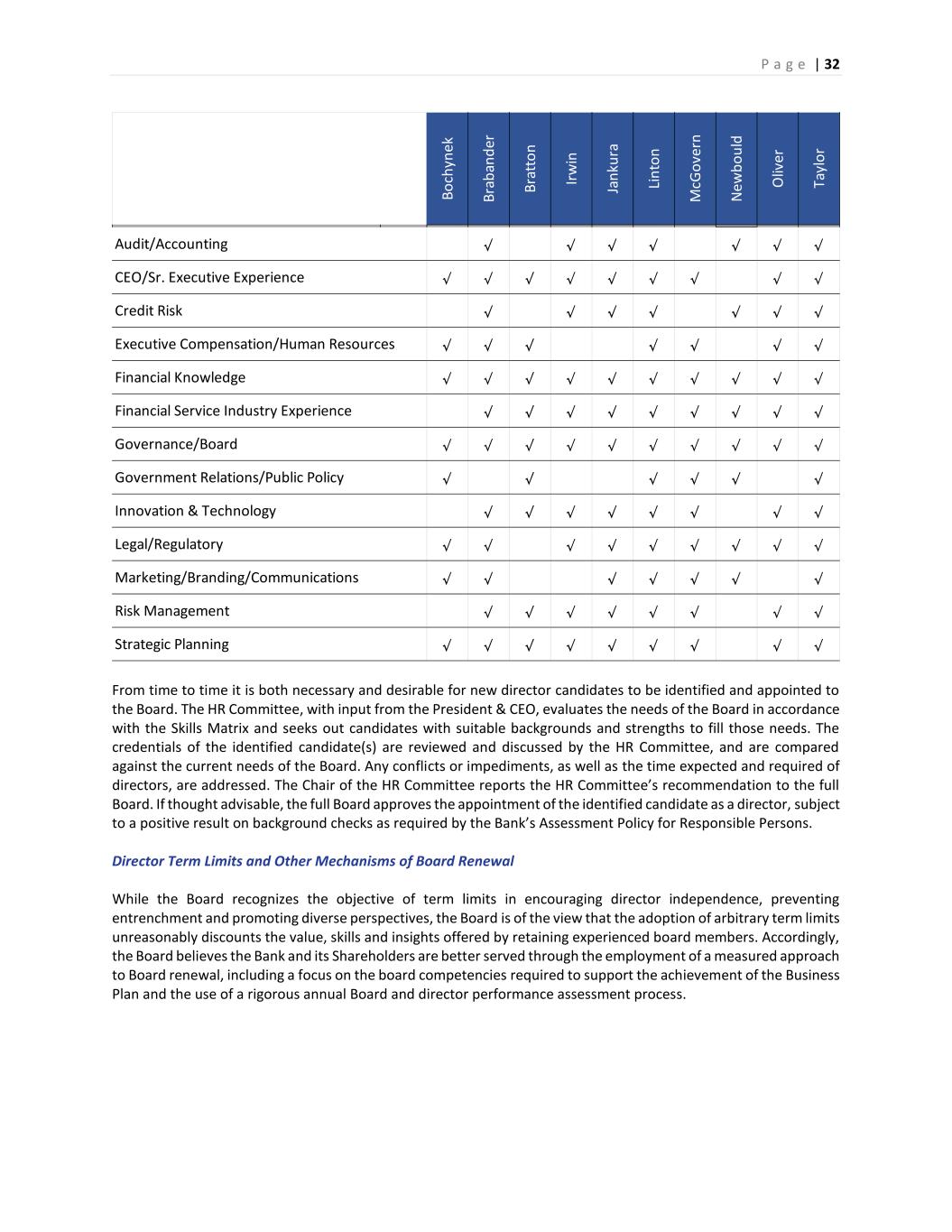 P a g e | 32 From time to time it is both necessary and desirable for new director candidates to be identified and appointed to the Board. The HR Committee, with input from the President & CEO, evaluates the needs of the Board in accordance with the Skills Matrix and seeks out candidates with suitable backgrounds and strengths to fill those needs. The credentials of the identified candidate(s) are reviewed and discussed by the HR Committee, and are compared against the current needs of the Board. Any conflicts or impediments, as well as the time expected and required of directors, are addressed. The Chair of the HR Committee reports the HR Committee’s recommendation to the full Board. If thought advisable, the full Board approves the appointment of the identified candidate as a director, subject to a positive result on background checks as required by the Bank’s Assessment Policy for Responsible Persons. Director Term Limits and Other Mechanisms of Board Renewal While the Board recognizes the objective of term limits in encouraging director independence, preventing entrenchment and promoting diverse perspectives, the Board is of the view that the adoption of arbitrary term limits unreasonably discounts the value, skills and insights offered by retaining experienced board members. Accordingly, the Board believes the Bank and its Shareholders are better served through the employment of a measured approach to Board renewal, including a focus on the board competencies required to support the achievement of the Business Plan and the use of a rigorous annual Board and director performance assessment process. B o ch yn ek B ra b an d er B ra tt o n Ir w in Ja n ku ra Li n to n M cG o ve rn N ew b o u ld O liv er Ta yl o r √ √ √ √ √ √ √ √ √ √ √ √ √ √ √ √ √ √ √ √ √ √ √ √ √ √ √ √ √ √ √ √ √ √ √ √ √ √ √ √ √ √ √ √ √ √ √ √ √ √ √ √ √ √ √ √ √ √ √ √ √ √ √ √ √ √ √ √ √ √ √ √ √ √ √ √ √ √ √ √ √ √ √ √ √ √ √ √ √ √ √ √ √ √ √ √ √ √ √ √ √ √ √ √ √ √ Financial Service Industry Experience Governance/Board Government Relations/Public Policy Innovation & Technology Legal/Regulatory Marketing/Branding/Communications Risk Management Strategic Planning CEO/Sr. Executive Experience Credit Risk Executive Compensation/Human Resources Financial Knowledge Audit/Accounting