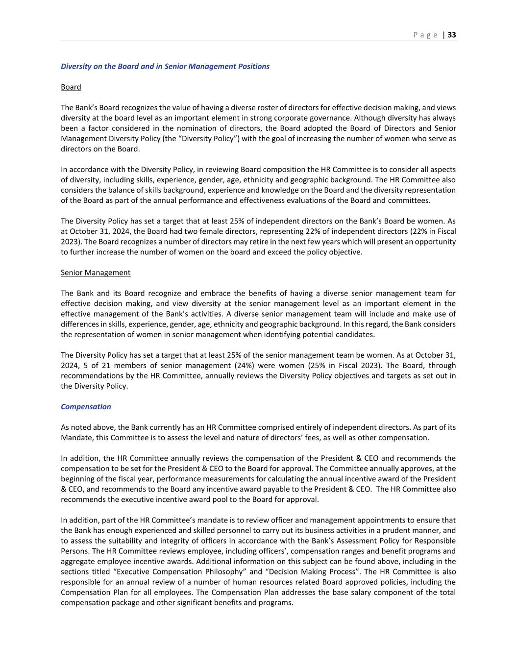 P a g e | 33 Diversity on the Board and in Senior Management Positions Board The Bank’s Board recognizes the value of having a diverse roster of directors for effective decision making, and views diversity at the board level as an important element in strong corporate governance. Although diversity has always been a factor considered in the nomination of directors, the Board adopted the Board of Directors and Senior Management Diversity Policy (the “Diversity Policy”) with the goal of increasing the number of women who serve as directors on the Board. In accordance with the Diversity Policy, in reviewing Board composition the HR Committee is to consider all aspects of diversity, including skills, experience, gender, age, ethnicity and geographic background. The HR Committee also considers the balance of skills background, experience and knowledge on the Board and the diversity representation of the Board as part of the annual performance and effectiveness evaluations of the Board and committees. The Diversity Policy has set a target that at least 25% of independent directors on the Bank’s Board be women. As at October 31, 2024, the Board had two female directors, representing 22% of independent directors (22% in Fiscal 2023). The Board recognizes a number of directors may retire in the next few years which will present an opportunity to further increase the number of women on the board and exceed the policy objective. Senior Management The Bank and its Board recognize and embrace the benefits of having a diverse senior management team for effective decision making, and view diversity at the senior management level as an important element in the effective management of the Bank’s activities. A diverse senior management team will include and make use of differences in skills, experience, gender, age, ethnicity and geographic background. In this regard, the Bank considers the representation of women in senior management when identifying potential candidates. The Diversity Policy has set a target that at least 25% of the senior management team be women. As at October 31, 2024, 5 of 21 members of senior management (24%) were women (25% in Fiscal 2023). The Board, through recommendations by the HR Committee, annually reviews the Diversity Policy objectives and targets as set out in the Diversity Policy. Compensation As noted above, the Bank currently has an HR Committee comprised entirely of independent directors. As part of its Mandate, this Committee is to assess the level and nature of directors’ fees, as well as other compensation. In addition, the HR Committee annually reviews the compensation of the President & CEO and recommends the compensation to be set for the President & CEO to the Board for approval. The Committee annually approves, at the beginning of the fiscal year, performance measurements for calculating the annual incentive award of the President & CEO, and recommends to the Board any incentive award payable to the President & CEO. The HR Committee also recommends the executive incentive award pool to the Board for approval. In addition, part of the HR Committee’s mandate is to review officer and management appointments to ensure that the Bank has enough experienced and skilled personnel to carry out its business activities in a prudent manner, and to assess the suitability and integrity of officers in accordance with the Bank’s Assessment Policy for Responsible Persons. The HR Committee reviews employee, including officers’, compensation ranges and benefit programs and aggregate employee incentive awards. Additional information on this subject can be found above, including in the sections titled “Executive Compensation Philosophy” and “Decision Making Process”. The HR Committee is also responsible for an annual review of a number of human resources related Board approved policies, including the Compensation Plan for all employees. The Compensation Plan addresses the base salary component of the total compensation package and other significant benefits and programs.