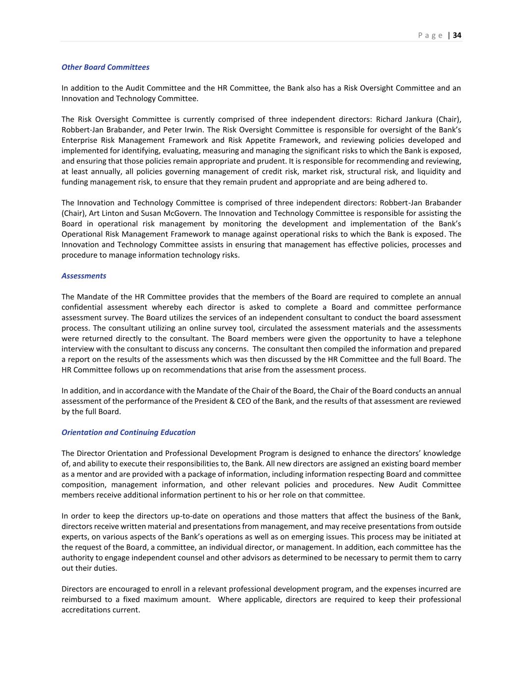 P a g e | 34 Other Board Committees In addition to the Audit Committee and the HR Committee, the Bank also has a Risk Oversight Committee and an Innovation and Technology Committee. The Risk Oversight Committee is currently comprised of three independent directors: Richard Jankura (Chair), Robbert-Jan Brabander, and Peter Irwin. The Risk Oversight Committee is responsible for oversight of the Bank’s Enterprise Risk Management Framework and Risk Appetite Framework, and reviewing policies developed and implemented for identifying, evaluating, measuring and managing the significant risks to which the Bank is exposed, and ensuring that those policies remain appropriate and prudent. It is responsible for recommending and reviewing, at least annually, all policies governing management of credit risk, market risk, structural risk, and liquidity and funding management risk, to ensure that they remain prudent and appropriate and are being adhered to. The Innovation and Technology Committee is comprised of three independent directors: Robbert-Jan Brabander (Chair), Art Linton and Susan McGovern. The Innovation and Technology Committee is responsible for assisting the Board in operational risk management by monitoring the development and implementation of the Bank’s Operational Risk Management Framework to manage against operational risks to which the Bank is exposed. The Innovation and Technology Committee assists in ensuring that management has effective policies, processes and procedure to manage information technology risks. Assessments The Mandate of the HR Committee provides that the members of the Board are required to complete an annual confidential assessment whereby each director is asked to complete a Board and committee performance assessment survey. The Board utilizes the services of an independent consultant to conduct the board assessment process. The consultant utilizing an online survey tool, circulated the assessment materials and the assessments were returned directly to the consultant. The Board members were given the opportunity to have a telephone interview with the consultant to discuss any concerns. The consultant then compiled the information and prepared a report on the results of the assessments which was then discussed by the HR Committee and the full Board. The HR Committee follows up on recommendations that arise from the assessment process. In addition, and in accordance with the Mandate of the Chair of the Board, the Chair of the Board conducts an annual assessment of the performance of the President & CEO of the Bank, and the results of that assessment are reviewed by the full Board. Orientation and Continuing Education The Director Orientation and Professional Development Program is designed to enhance the directors’ knowledge of, and ability to execute their responsibilities to, the Bank. All new directors are assigned an existing board member as a mentor and are provided with a package of information, including information respecting Board and committee composition, management information, and other relevant policies and procedures. New Audit Committee members receive additional information pertinent to his or her role on that committee. In order to keep the directors up-to-date on operations and those matters that affect the business of the Bank, directors receive written material and presentations from management, and may receive presentations from outside experts, on various aspects of the Bank’s operations as well as on emerging issues. This process may be initiated at the request of the Board, a committee, an individual director, or management. In addition, each committee has the authority to engage independent counsel and other advisors as determined to be necessary to permit them to carry out their duties. Directors are encouraged to enroll in a relevant professional development program, and the expenses incurred are reimbursed to a fixed maximum amount. Where applicable, directors are required to keep their professional accreditations current.