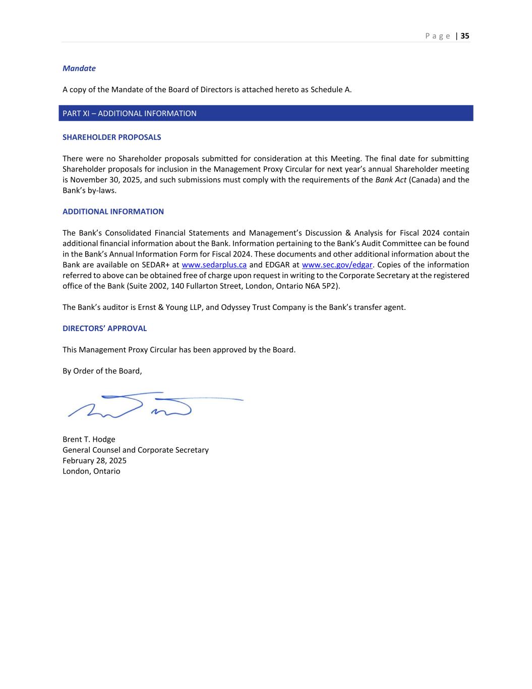 P a g e | 35 Mandate A copy of the Mandate of the Board of Directors is attached hereto as Schedule A. PART XI – ADDITIONAL INFORMATION SHAREHOLDER PROPOSALS There were no Shareholder proposals submitted for consideration at this Meeting. The final date for submitting Shareholder proposals for inclusion in the Management Proxy Circular for next year’s annual Shareholder meeting is November 30, 2025, and such submissions must comply with the requirements of the Bank Act (Canada) and the Bank’s by-laws. ADDITIONAL INFORMATION The Bank’s Consolidated Financial Statements and Management’s Discussion & Analysis for Fiscal 2024 contain additional financial information about the Bank. Information pertaining to the Bank’s Audit Committee can be found in the Bank’s Annual Information Form for Fiscal 2024. These documents and other additional information about the Bank are available on SEDAR+ at www.sedarplus.ca and EDGAR at www.sec.gov/edgar. Copies of the information referred to above can be obtained free of charge upon request in writing to the Corporate Secretary at the registered office of the Bank (Suite 2002, 140 Fullarton Street, London, Ontario N6A 5P2). The Bank’s auditor is Ernst & Young LLP, and Odyssey Trust Company is the Bank’s transfer agent. DIRECTORS’ APPROVAL This Management Proxy Circular has been approved by the Board. By Order of the Board, Brent T. Hodge General Counsel and Corporate Secretary February 28, 2025 London, Ontario
